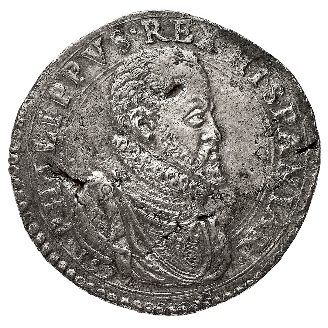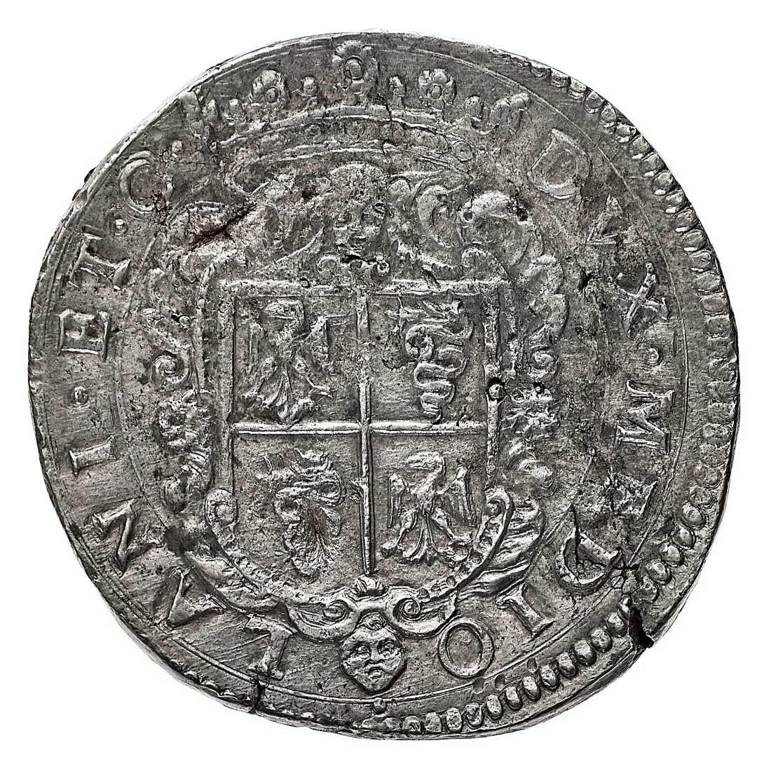 Filippo II di Spagna (1556-1598) - Scudo o Ducatone 1592 - Diritto: busto corazzato con gorgiera di Filippo II a destra - Rovescio: stemma di Milano coronato - gr. 32,20 - Rara - Usuali difetti di conio, q.SPL