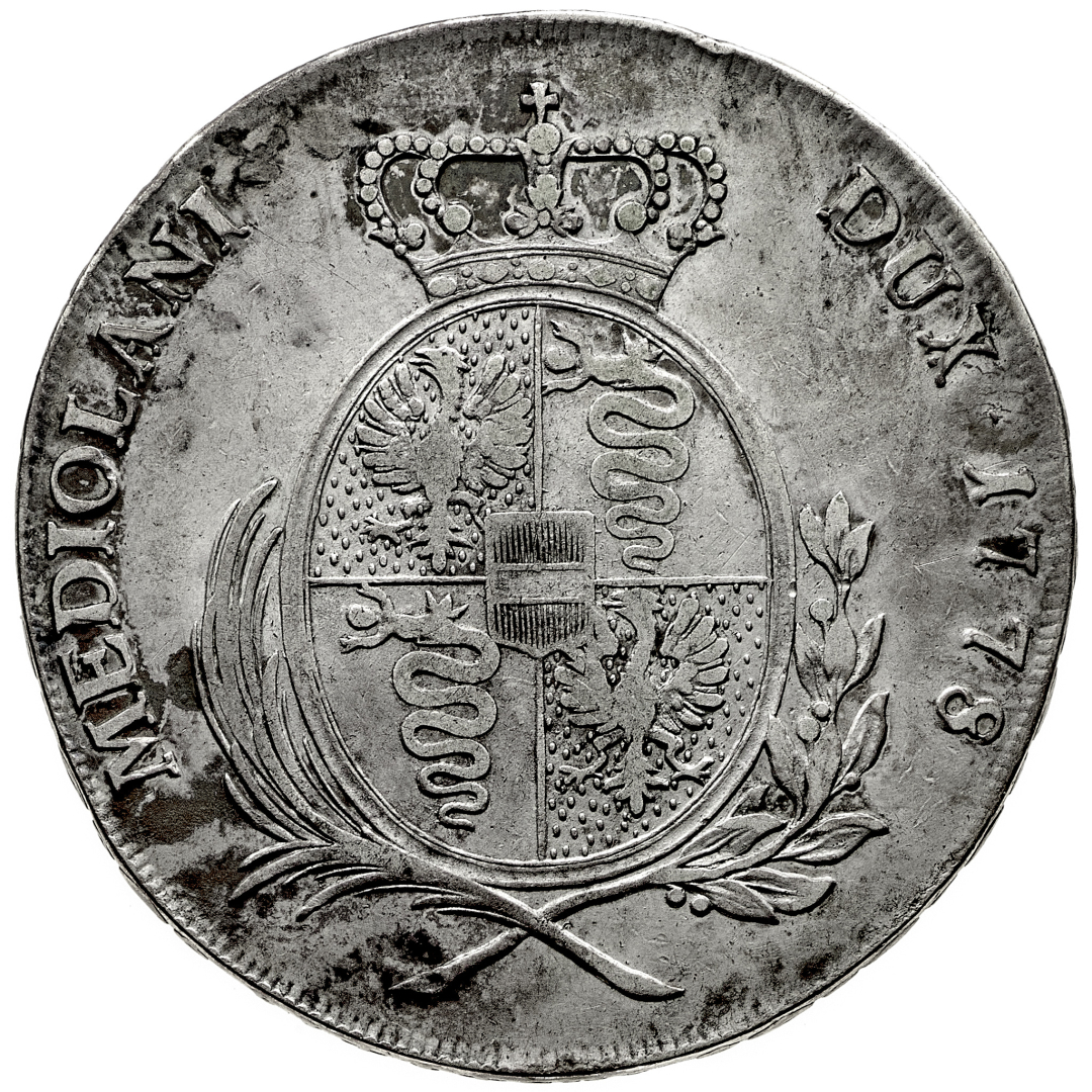 Maria Teresa d'Asburgo (1740-1780) - Scudo 1778 - Diritto: busto velato di Maria Teresa a destra - Rovescio: stemma coronato d'Austria e di Milano entro rami di alloro e di palma - gr. 22,90 - BB