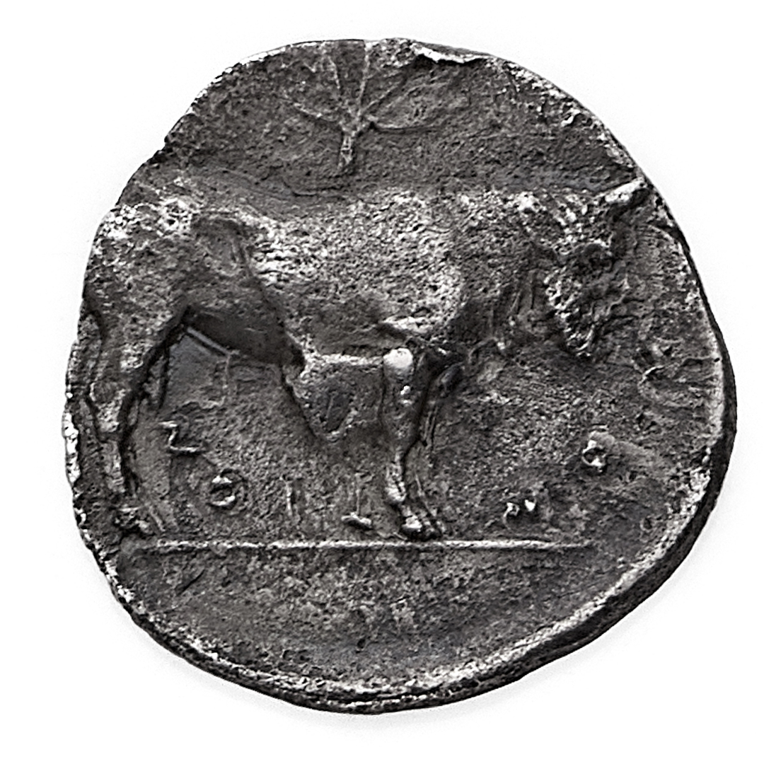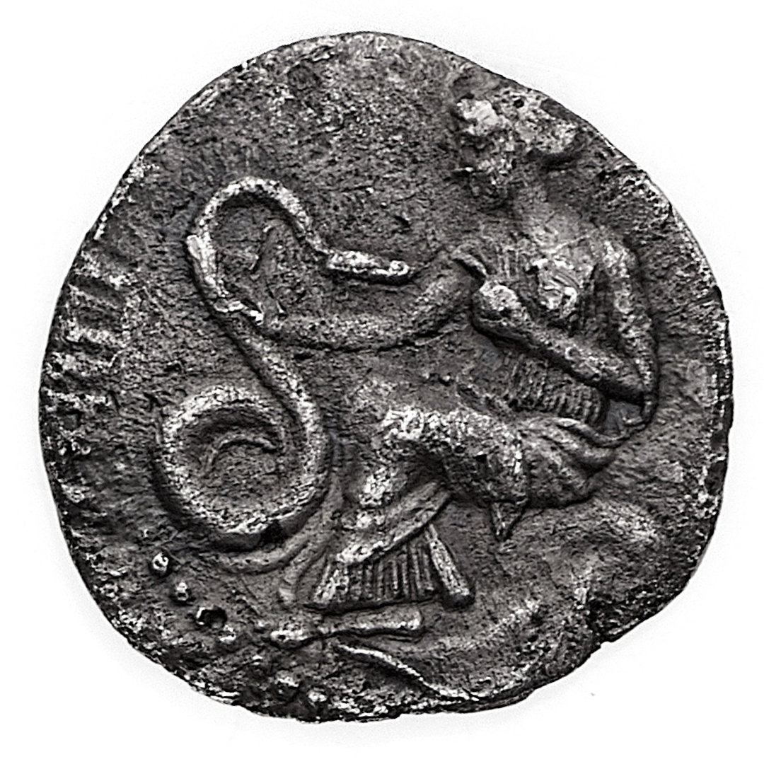 Selinunte - Litra databile al periodo 348-336 a.C. - Diritto: ninfa seduta su una roccia a sinistra tocca un serpente con la mano destra e solleva la sinistra sopra il capo - Rovescio: toro androcefalo stante a destra sormontato da una foglia di silene - gr. 0,63 - Non comune - Migliore di BB - Corredata da cartellino di provenienza