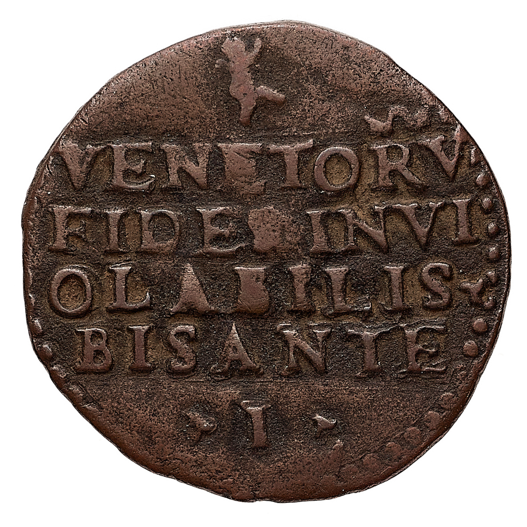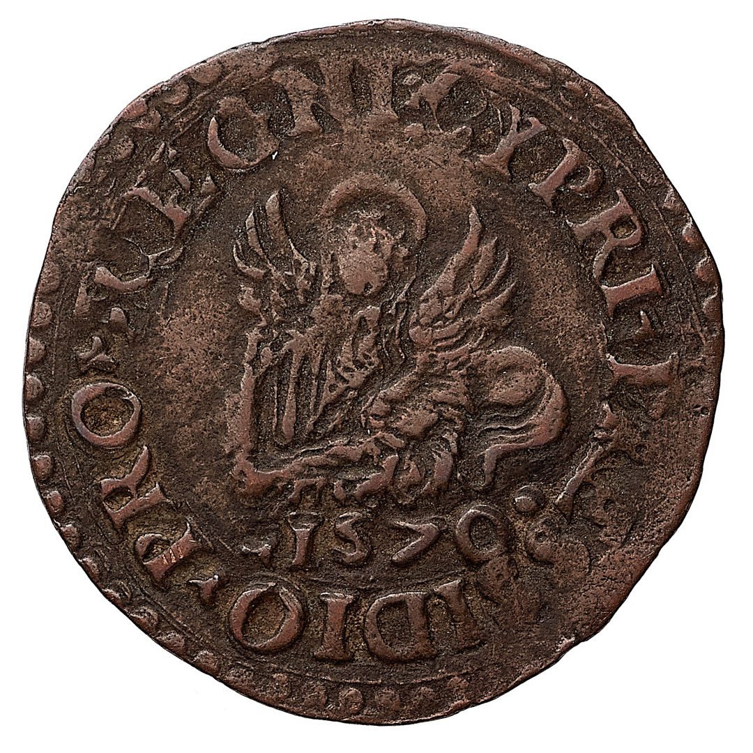 Pietro Loredan (1567-1570) - Assedio di Famagosta (1570) - Bisante ossidionale 1570 - Zecca: Famagosta - Diritto: il leone di San Marco a sinistra - Rovescio: legenda su quattro righe orizzontali sormontata da un amorino - gr. 3,73 - Rara - BB