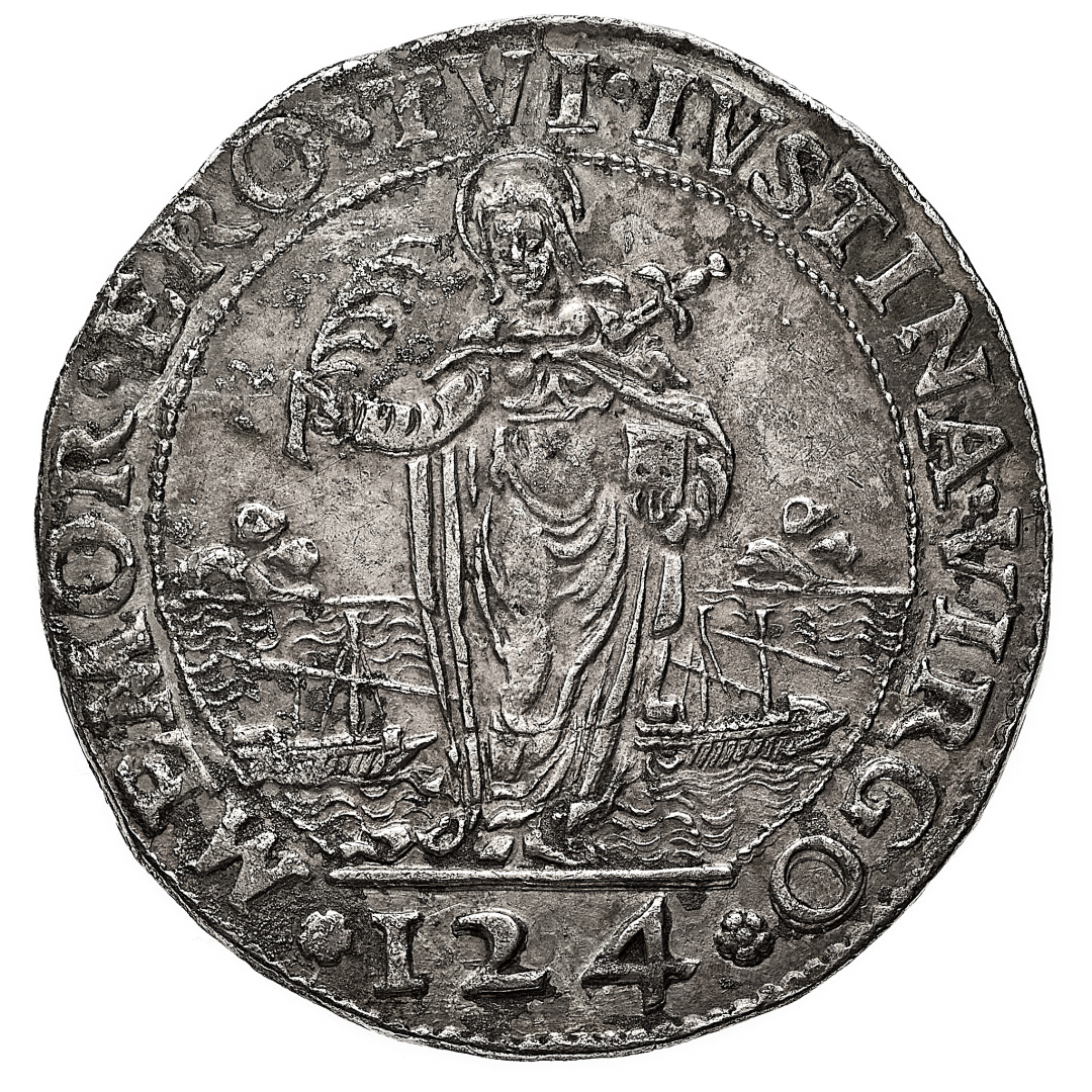 Pasquale Cicogna (1585-1595) - Ducato con Santa Giustina da 124 Soldi - Zecca: Venezia - Diritto: il Doge genuflesso verso sinistra stringe il vessillo della Repubblica di fronte al leone alato a destra - Rovescio: Santa Giustina stante in posizione frontale tiene con la mano destra un ramo di palma e con la sinistra un libro; ha il petto trafitto da un pugnale; sullo sfondo il mare agitato con due galere - gr. 27,78 - Rara - SPL