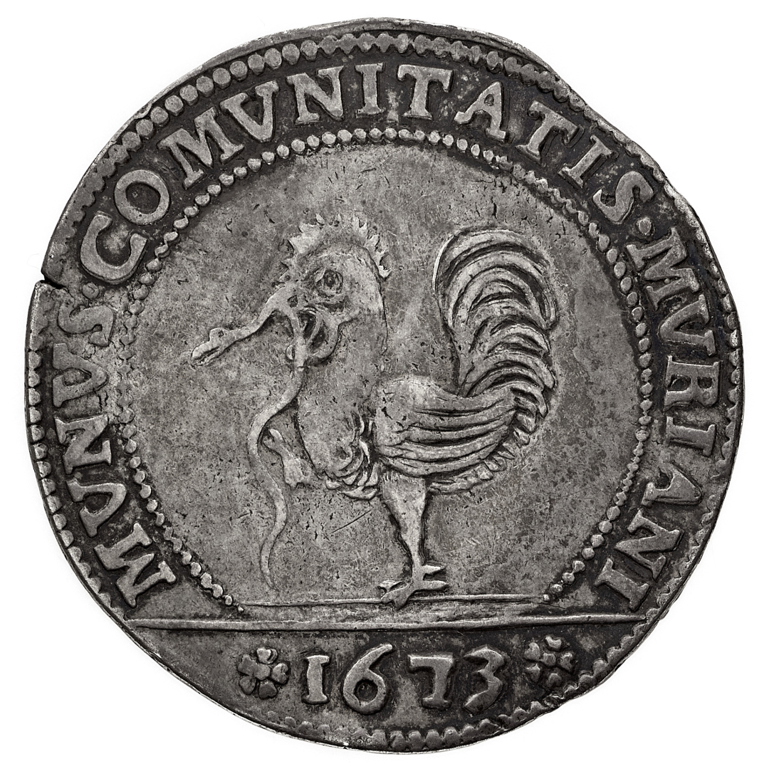 Domenico Contarini (1659-1675) - Osella di Murano 1673 - Zecca: Murano - Diritto: il leone di San Marco rampante a sinistra regge tre stemmi con le zampe anteriori - Rovescio: il gallo di Murano con una serpe nel becco - gr. 9,49 - Molto rara - Patina di medagliere, BB - Proveniente dall'asta Sincona 6, Zurigo 23.5.2012, n. 1691