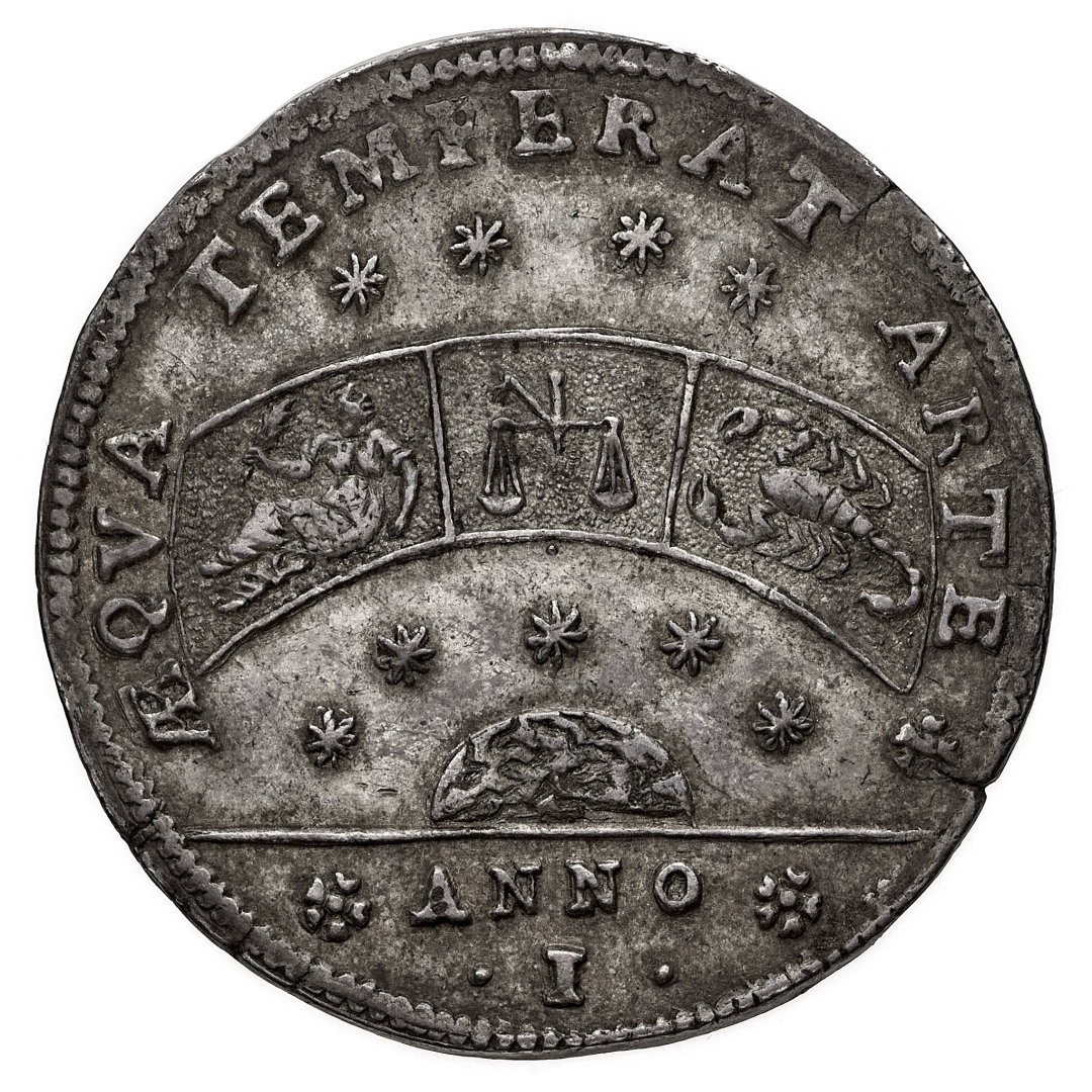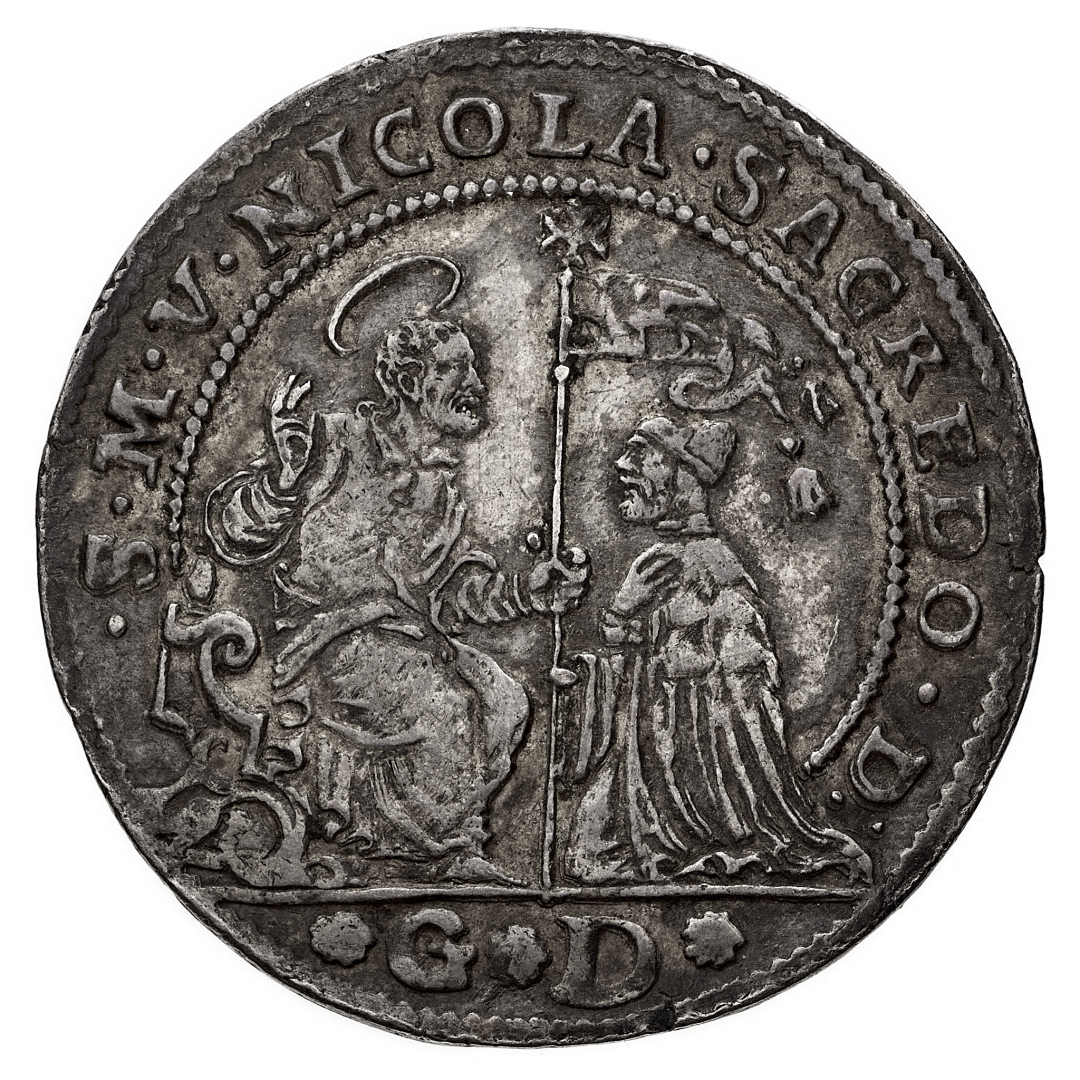 Nicolò Sagredo (1675-1676) - Osella Anno I (1675) - Zecca: Venezia - Diritto: il Doge genuflesso riceve da San Marco il vessillo della Repubblica - Rovescio: globo terrestre sormontato dalla fascia dello zodiaco - gr. 9,59 - Sigle GD - Rara - Magnifica patina di medagliere. q.SPL