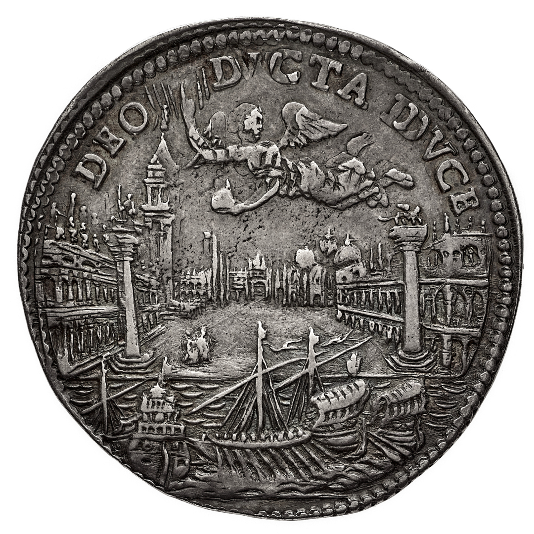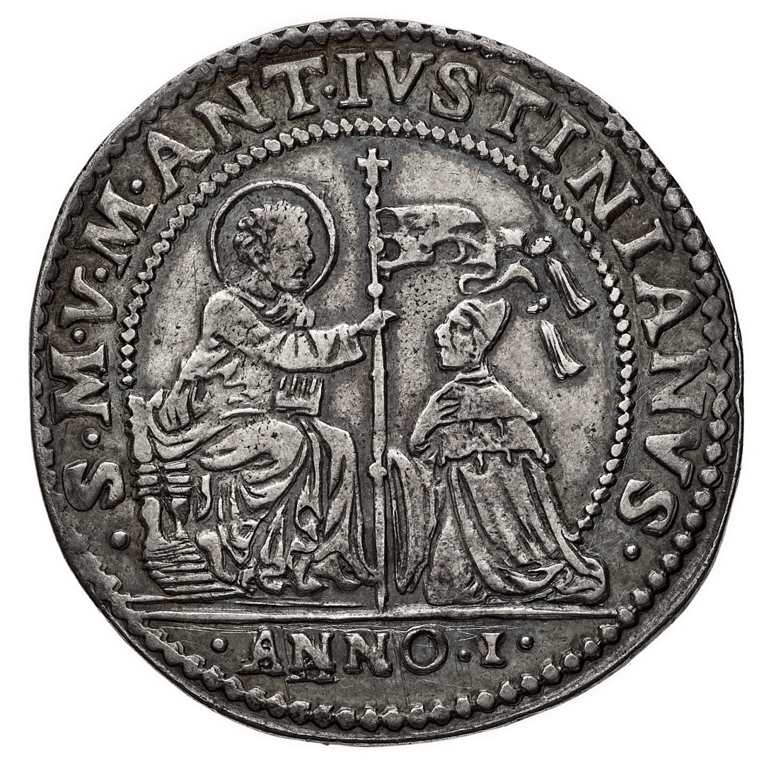 Marcantonio Giustinian (1684-1688) - Osella Anno I (1684) - Zecca: Venezia - Diritto: il Doge genuflesso riceve il vessillo della Repubblica da San Marco che gli siede di fronte - Rovescio: un angelo con il corno dogale in mano, librato in volo verso sinistra su piazza San Marco e sullo specchio d'acqua antistante, popolato di navigli - gr. 9,54 - Molto rara - Patina iridescente, migliore di BB