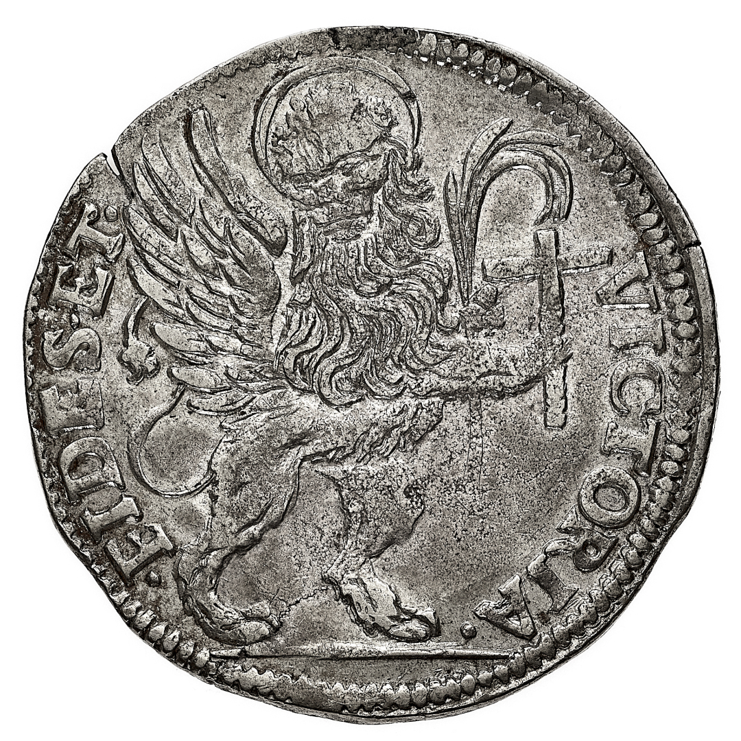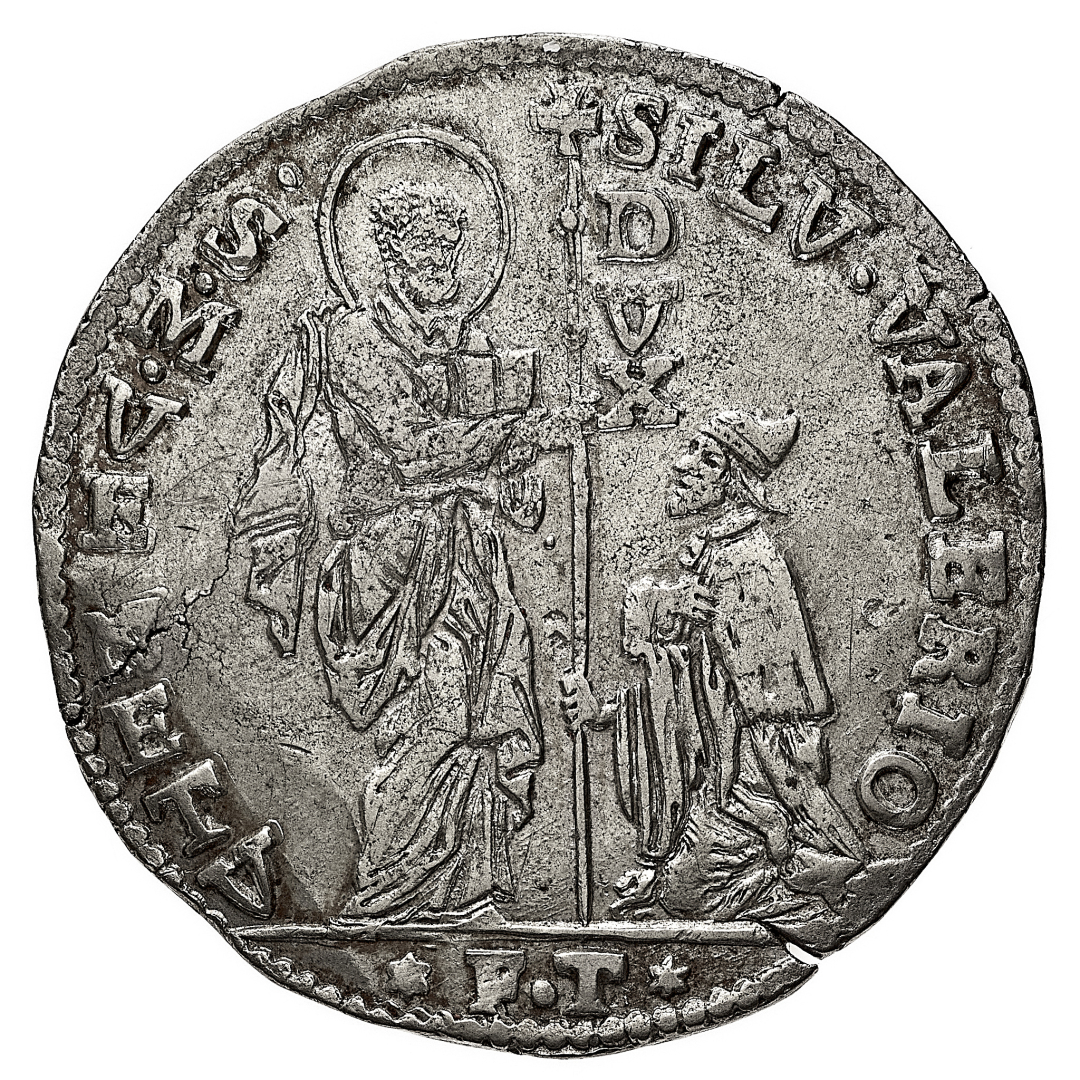 Silvestro Valier (1694-1700) - Leone per il Levante - Zecca: Venezia - Diritto: il Doge genuflesso riceve da San Marco il vessillo della Repubblica - Rovescio: il leone di San Marco rampante e retrospiciente regge una croce con la zampa destra e un ramo di palma con la sinistra - gr. 26,87 - Sigle FT - Rara - Leggeri difetti di conio, ma di buona qualità generale e con patina di medagliere, migliore di BB