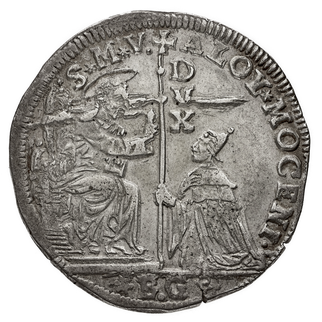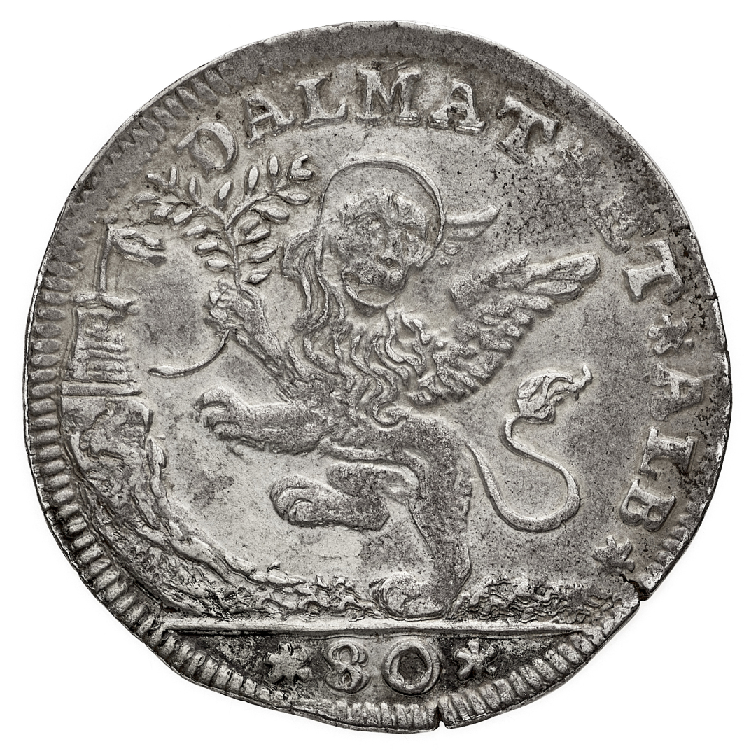 Alvise II Mocenigo (1700-1709) - Leone da 80 Soldi per la Dalmazia e l'Albania - Zecca: Venezia - Diritto: il Doge genuflesso tiene un'asta culminante in una croce e riceve la benedizione da San Marco che gli sta di fronte - Rovescio: il leone di San Marco rampante regge un ramo d'ulivo con la zampa destra - gr. 11,16 - Sigle GB - Rara - q.SPL