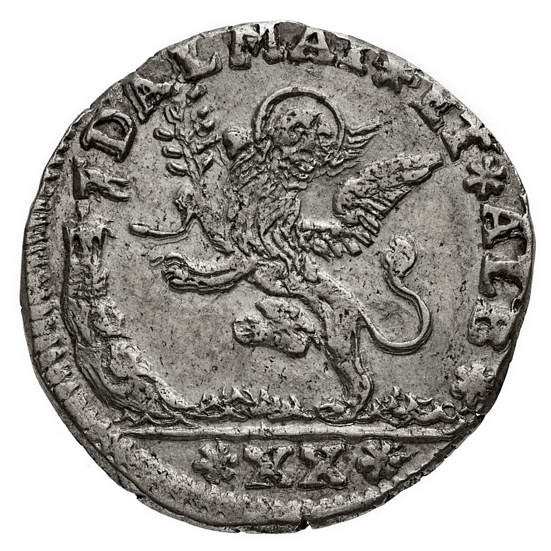 Alvise II Mocenigo (1700-1709) - Quarto di Leone da 20 Soldi per la Dalmazia e l'Albania - Zecca: Venezia - Diritto: il Doge genuflesso tiene un'asta culminante in una croce e riceve la benedizione da San Marco che gli sta di fronte - Rovescio: il leone di San Marco rampante regge un ramo d'ulivo con la zampa destra - gr. 2,81 - Sigle BC - Rara - SPL