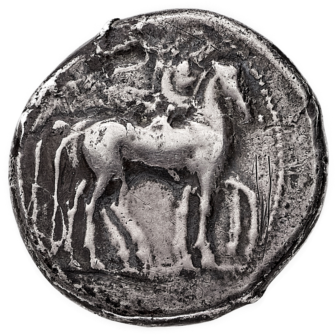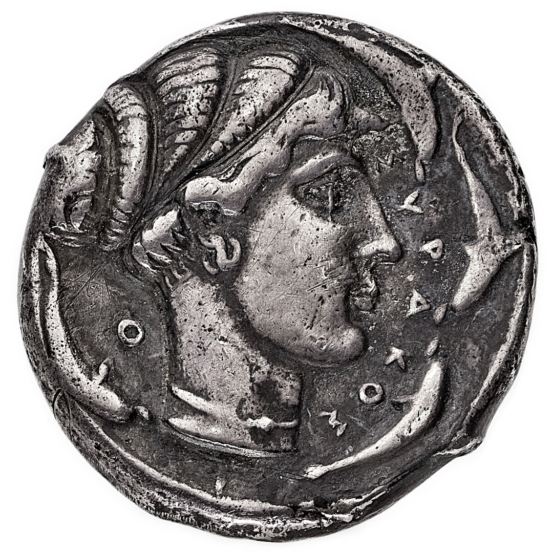 Siracusa - Periodo della Seconda Democrazia (466-406 a.C.) - Tetradramma databile al periodo 430-420 a.C. - Diritto: quadriga al passo verso destra sovrastata dalla Vittoria in volo nell'atto di incoronare i cavalli - Rovescio: testa di Aretusa a destra attorniata da quattro delfini - gr. 17,50 - Rara - BB