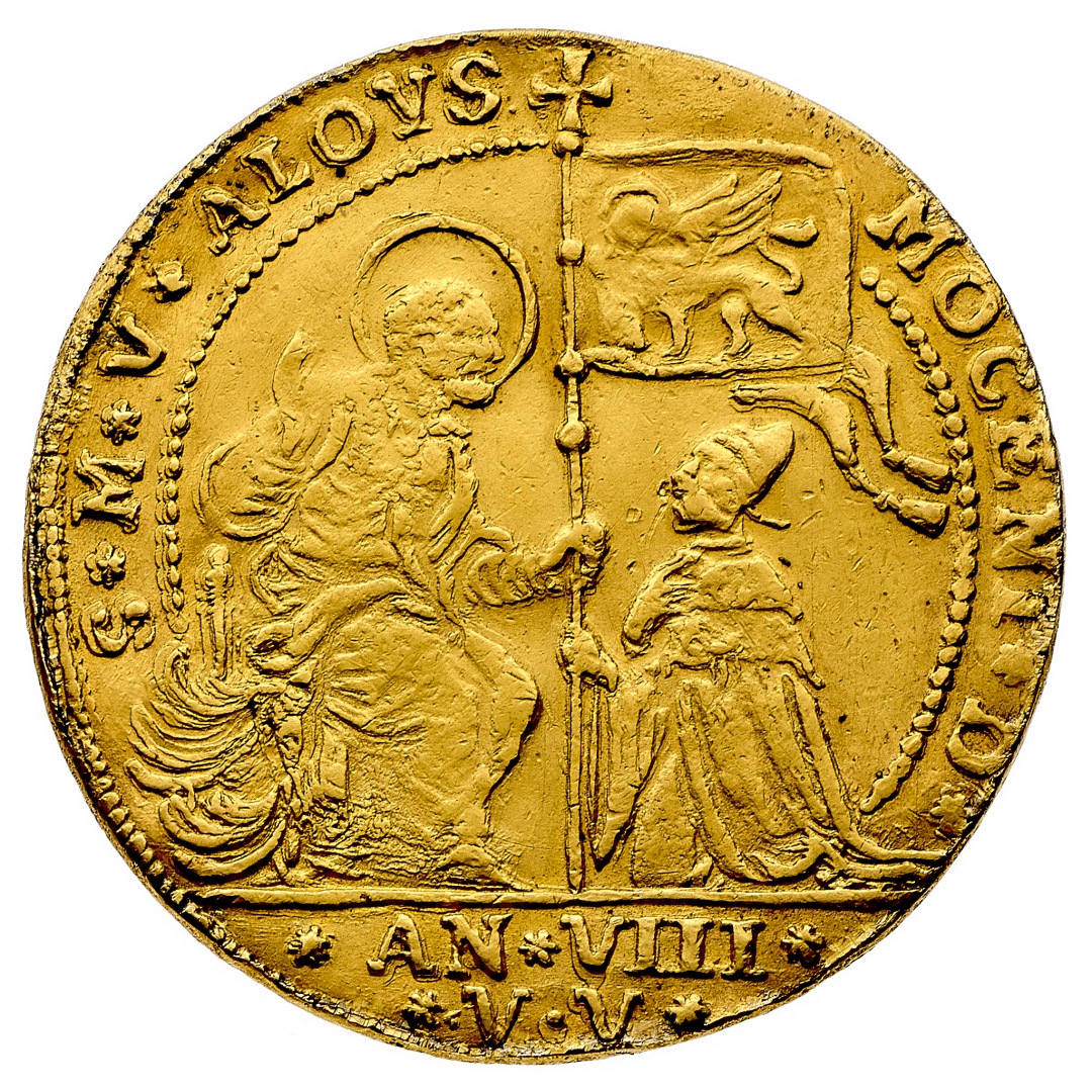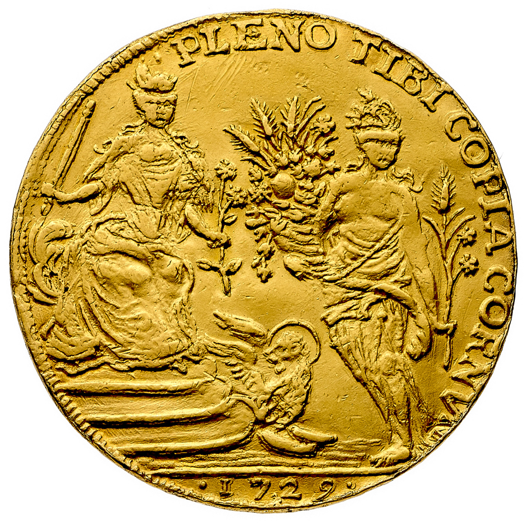 Alvise III Mocenigo (1722-1732) - Osella da 4 Zecchini Anno VIII (1729) - Diritto: il Doge genuflesso riceve da San Marco il vessillo della Repubblica - Rovescio: figura femminile, allegoria di Venezia sulla sinistra seduta sopra un trono, tiene uno scettro nella mano sinistra e un ramo di rose nella destra; a destra l'Abbondanza, in piedi di fronte, tiene con il braccio sinistro una cornucopia e con il destro una spiga - gr. 13,06 - Rara - Probabili tracce di montatura, altrimenti migliore di BB