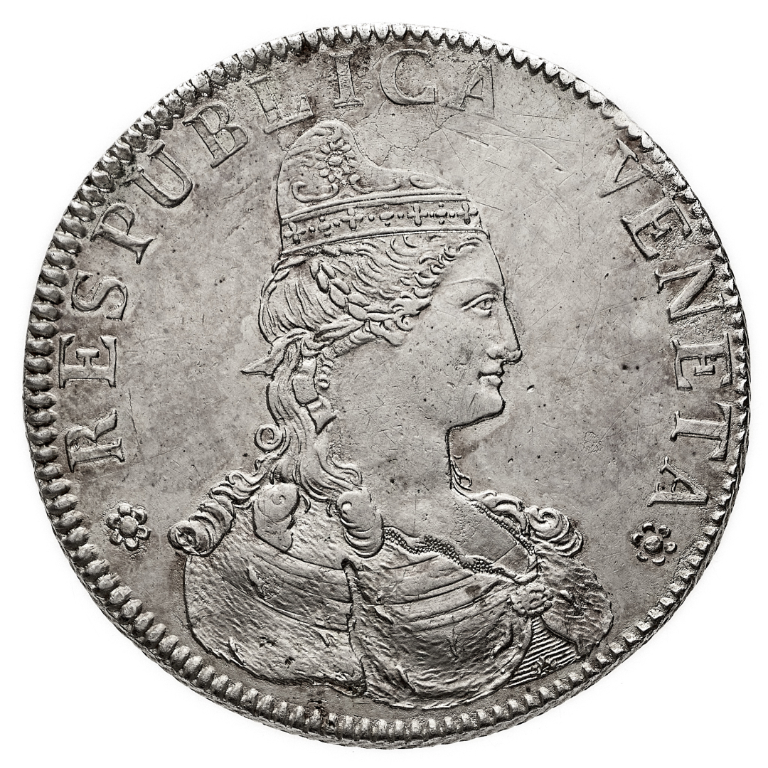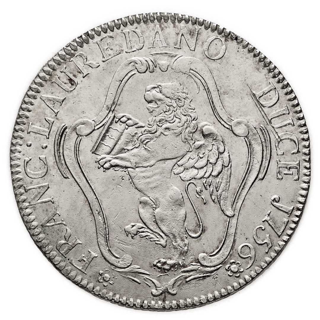 Francesco Loredan (1752-1762) - Tallero per il Levante 1756 - Zecca: Venezia - Diritto: leone alato rampante a sinistra tiene un libro fra le zampe anteriori; il tutto entro cornice barocca - Rovescio: busto muliebre a destra - gr. 28,51 - Molto rara - Lievi graffi, altrimenti SPL - Proveniente dall'asta Varesi 44, Pavia 11-12.11.2004, n. 237