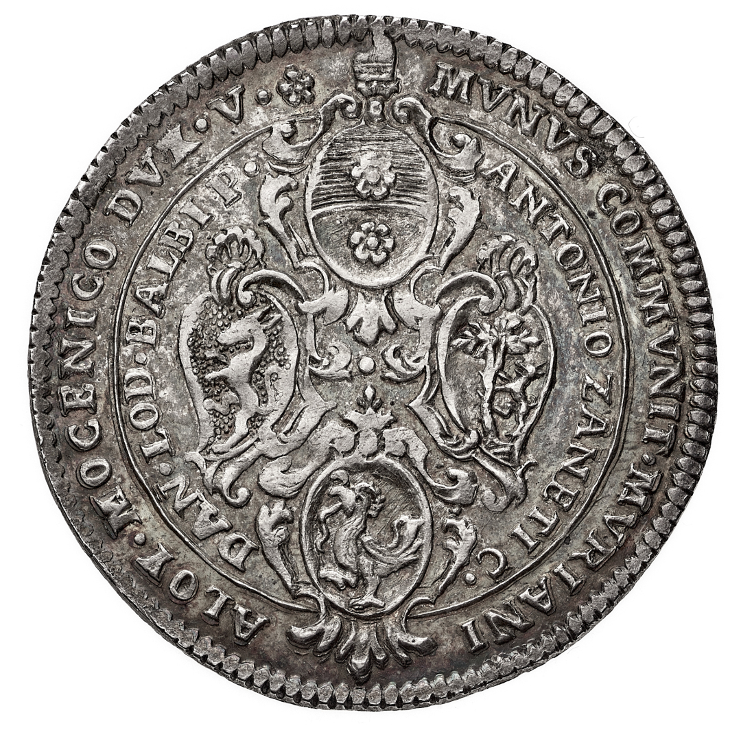 Alvise IV Mocenigo (1763-1778) - Osella di Murano 1771 - Zecca: Murano - Diritto: in alto lo stemma del Doge, sotto quello del Camerlengo e del Podestà, in basso il gallo di Murano - Rovescio: stemmi dei tre deputati disposti su due linee - gr. 9,76 - Molto rara - Patina di medagliere, migliore di SPL - Proveniente dall'asta NAC Autumn Sale 95, Zurigo 26-27.10.1995, n. 1279