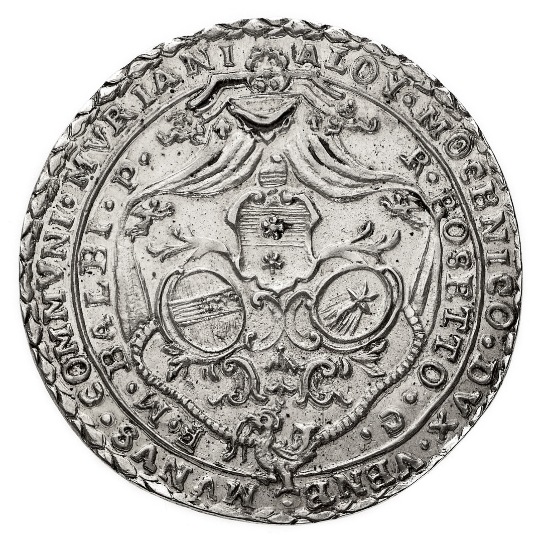 Alvise IV Mocenigo (1763-1778) - Osella di Murano 1778 - Zecca: Murano - Diritto: in alto lo stemma del Doge, sotto quello del Camerlengo e del Podestà, in basso il gallo di Murano, entro padiglione sorretto da due angeli - Rovescio: stemmi dei quattro deputati disposti su due linee sorretti da due putti - gr. 9,79 - Molto rara - SPL