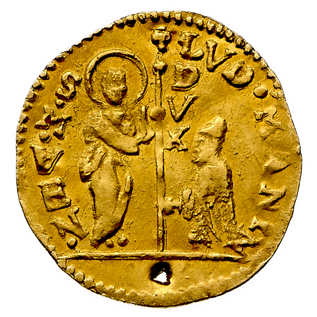 Ludovico Manin (1789-1797) - Quarto di Zecchino - Zecca: Venezia - Diritto: il Doge genuflesso tiene un'asta culminante in una croce e riceve la benedizione da San Marco che gli sta di fronte - Rovescio: Gesù Cristo benedicente entro una cornice a mandorla - gr. 0,88 - Rara - Foro, altrimenti q.SPL