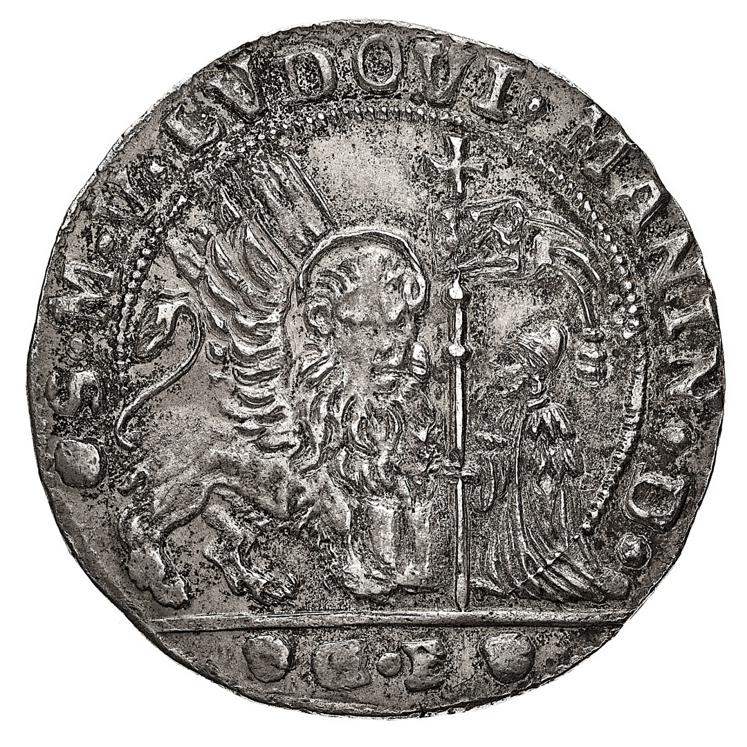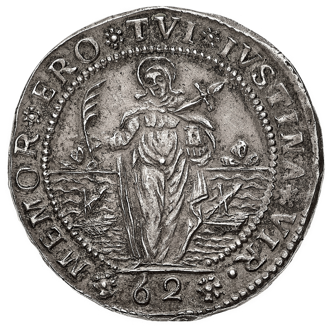 Ludovico Manin (1789-1797) - Mezzo Ducato con Santa Giustina da 62 Soldi - Zecca: Venezia - Diritto: il Doge genuflesso verso sinistra stringe il vessillo della Repubblica di fronte al leone alato a destra - Rovescio: Santa Giustina stante in posizione frontale tiene con la mano destra un ramo di palma e con la sinistra un libro; ha il petto trafitto da un pugnale; sullo sfondo il mare agitato con due galere - gr. 13,88 - Sigle GF - Molto rara - Patina di medagliere, SPL