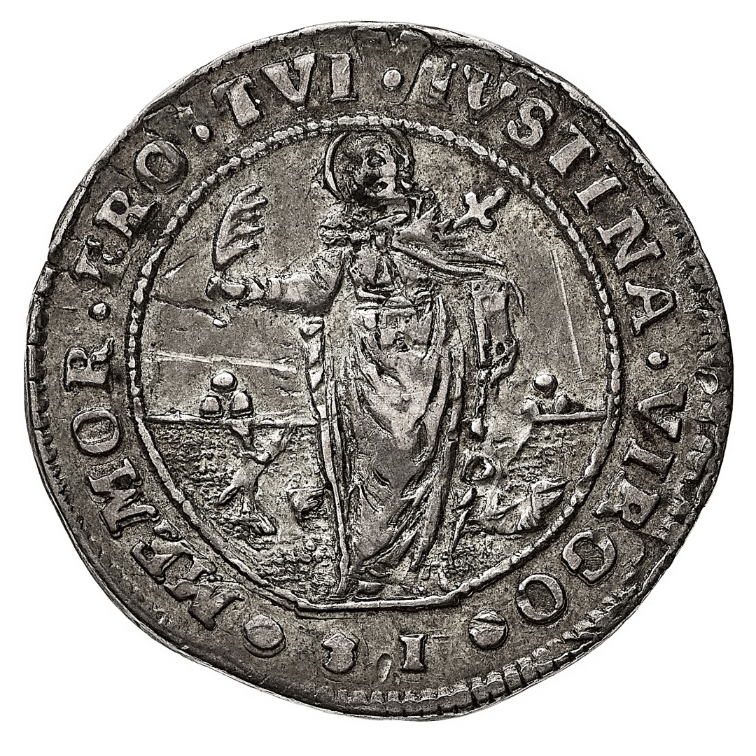 Ludovico Manin (1789-1797) - Quarto di Ducato con Santa Giustina da 31 Soldi - Zecca: Venezia - Diritto: il Doge genuflesso verso sinistra stringe il vessillo della Repubblica di fronte al leone alato a destra - Rovescio: Santa Giustina stante in posizione frontale tiene con la mano destra un ramo di palma e con la sinistra un libro; ha il petto trafitto da un pugnale; sullo sfondo il mare agitato con due galere - gr. 6,96 - Sigle GF - Rara - Patina iridescente, migliore di BB