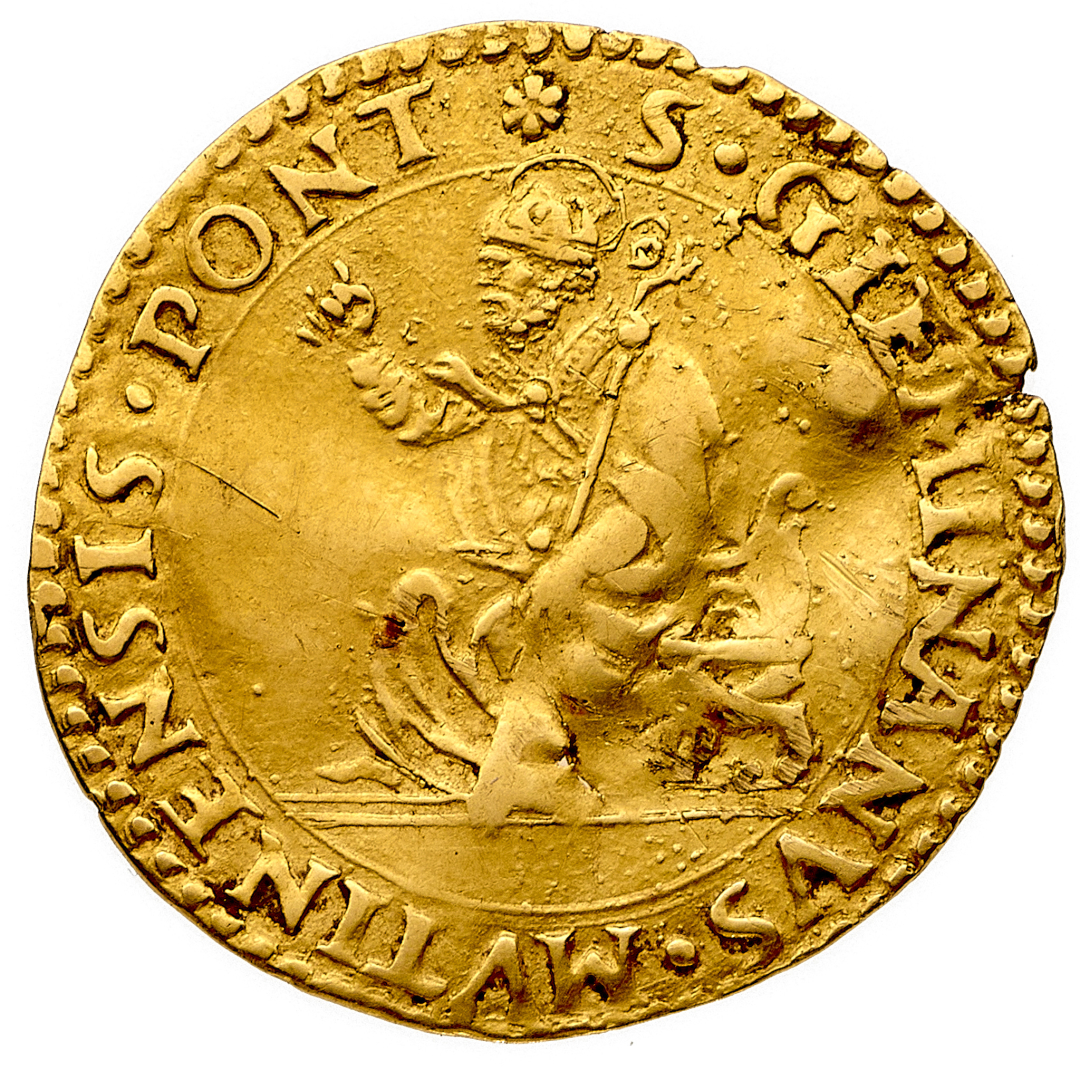 Ercole II d'Este (1534-1559) - Scudo d'oro - Zecca: Modena - Diritto: croce ornata accantonata da quattro gigli - Rovescio: San Geminiano seduto a sinistra alza la mano destra benedicente e tiene il pastorale con la sinistra - gr. 3,32 - Non comune - Lievi ondulazioni del tondello, BB