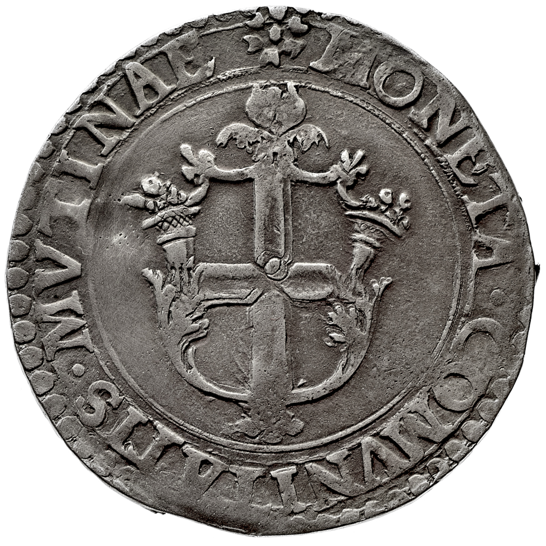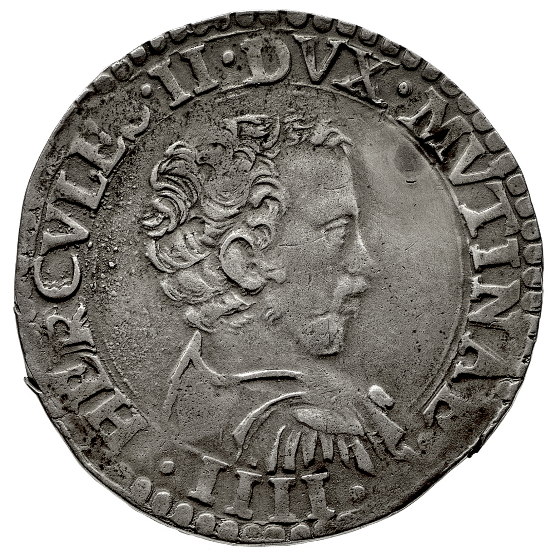Ercole II d'Este (1534-1559) - Bianco - Zecca: Modena - Diritto: busto del Duca corazzato a destra - Rovescio: stemma entro cartella ornata - gr. 4,98 - Rara - BB