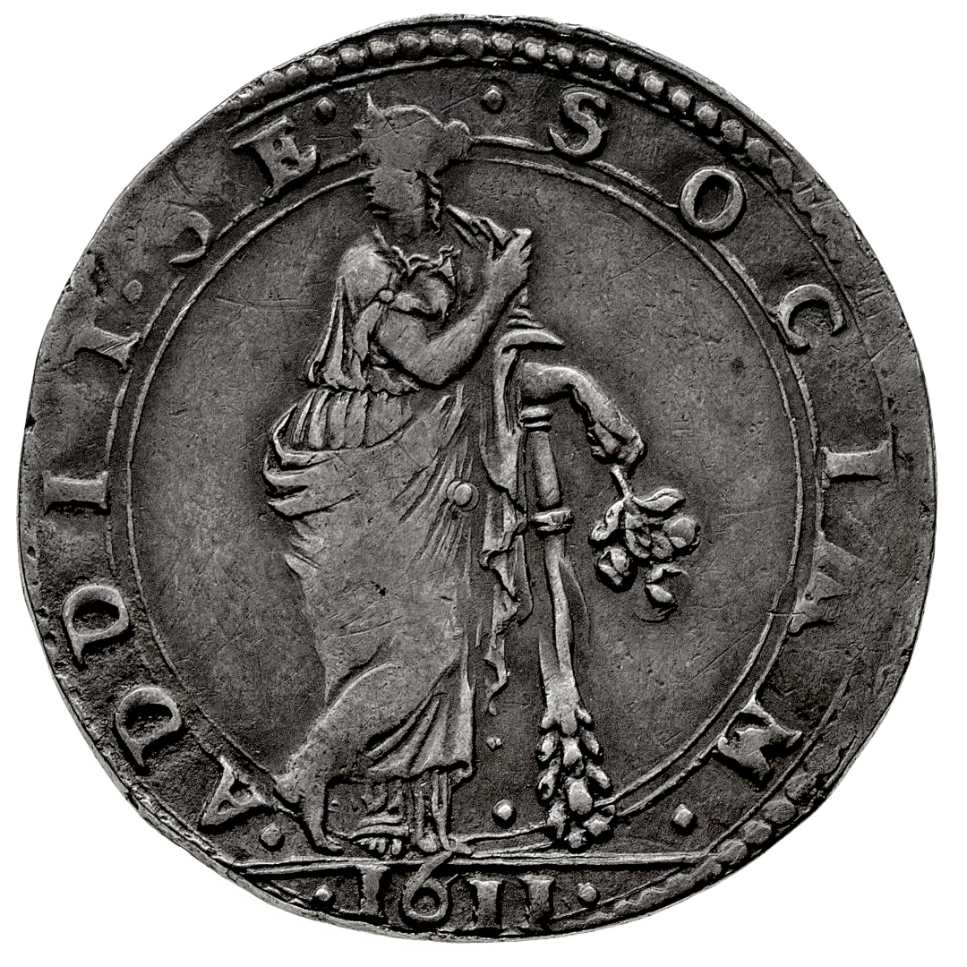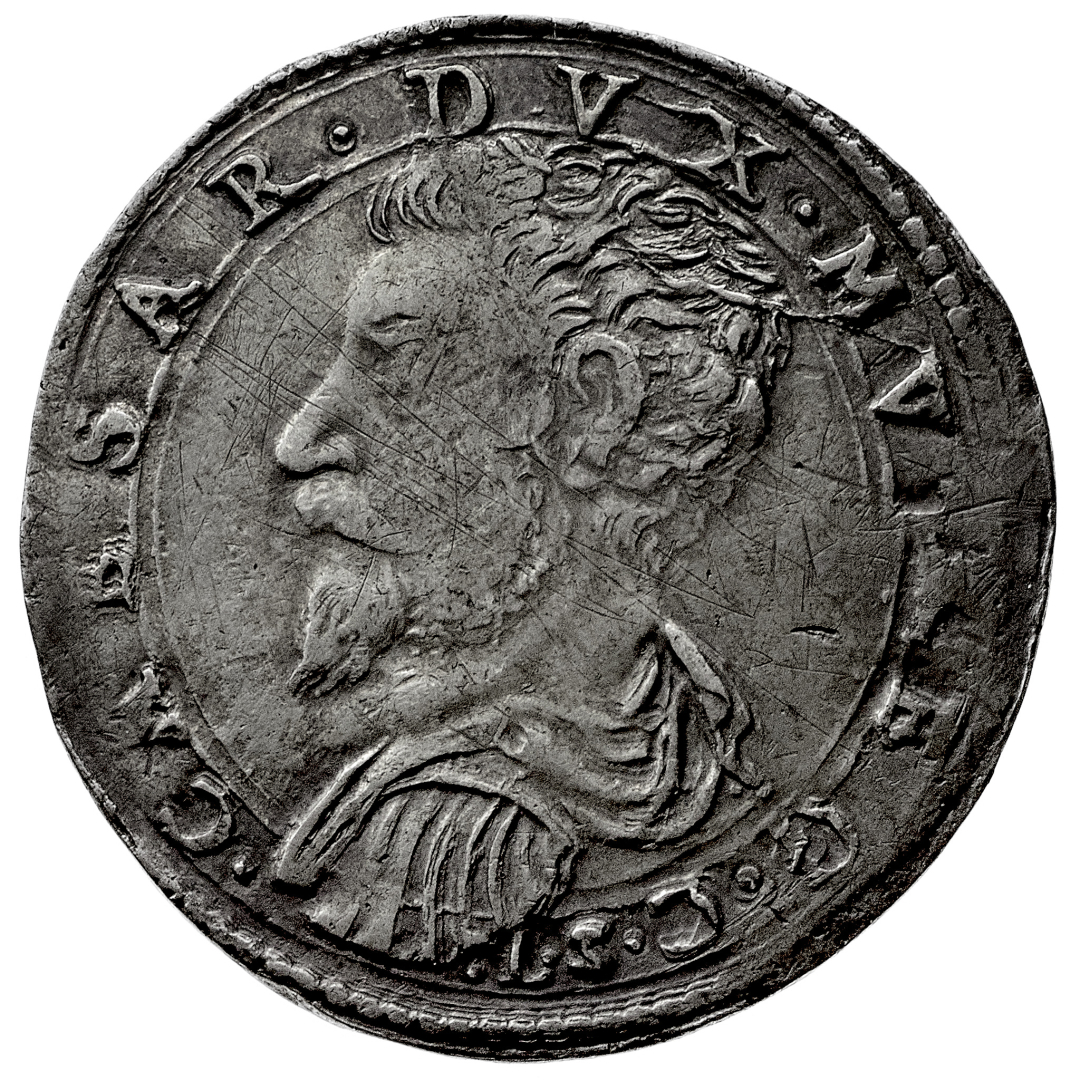 Cesare d'Este (1597-1628) - Lira 1611 - Zecca: Modena - Diritto: busto corazzato del Duca a sinistra - Rovescio: figura muliebre stante di fronte appoggiata a una clava, tiene un mazzo di fiori con la mano sinistra - gr. 5,63 - Rara - BB