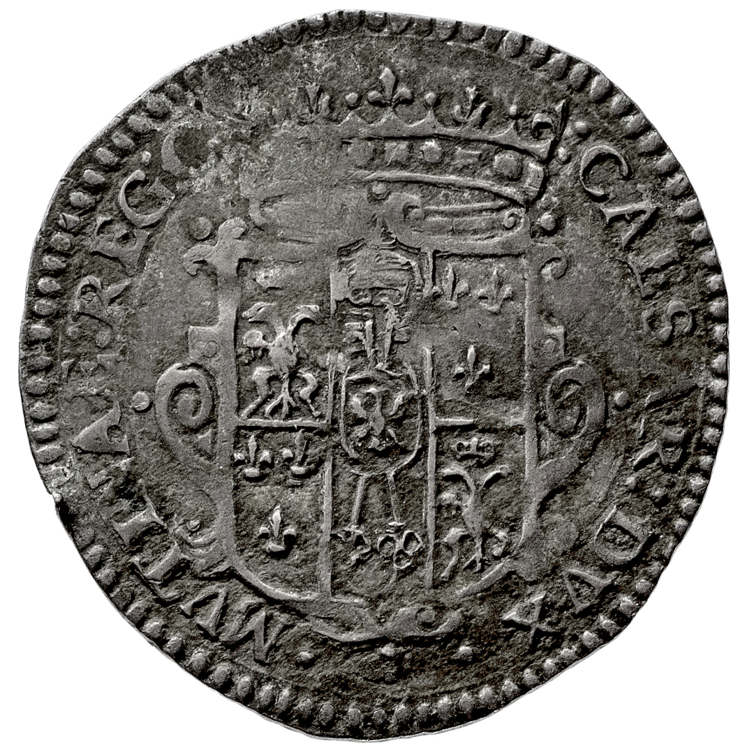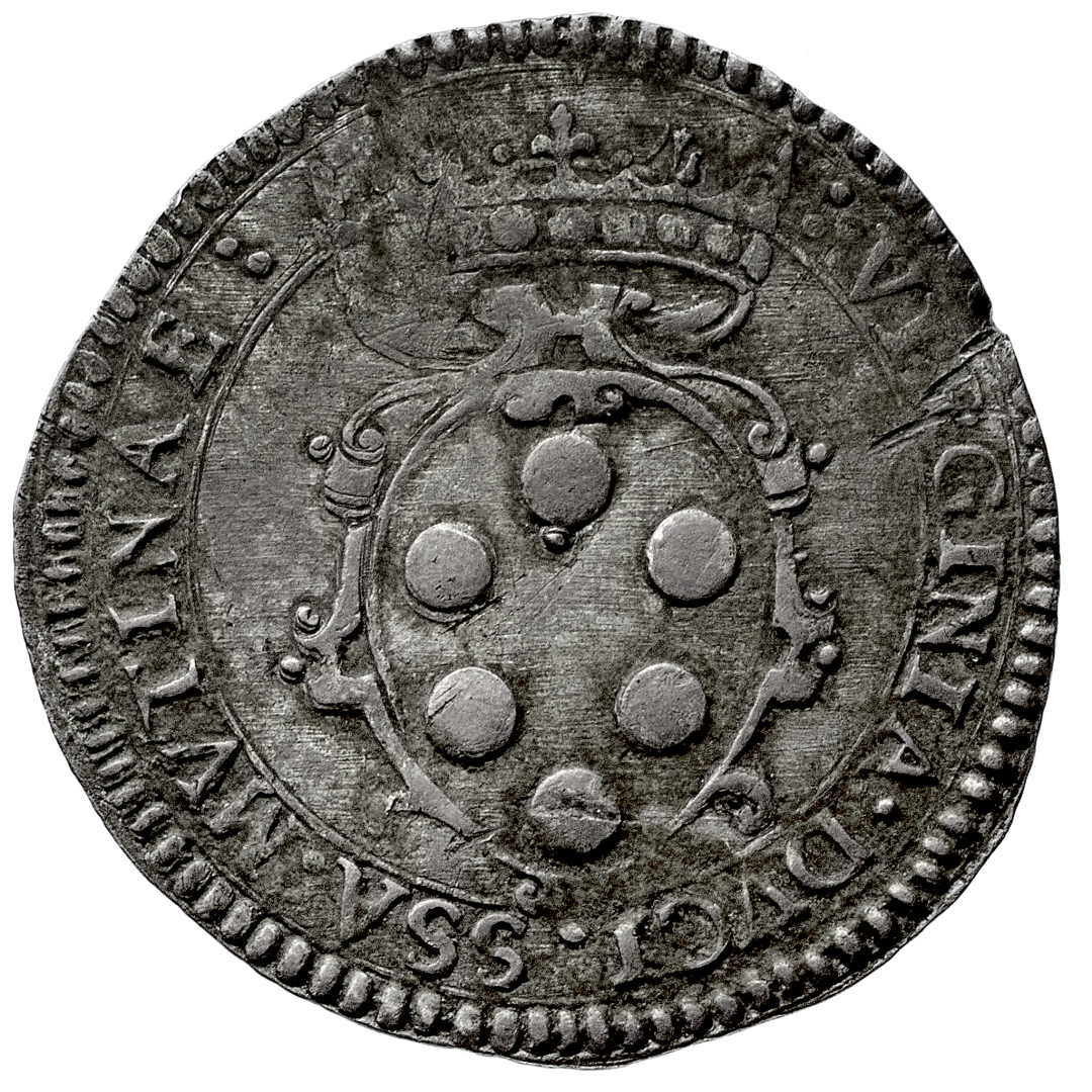 Cesare d'Este con la moglie Virginia de' Medici (1598-1615) - Da 6 Bolognini - Zecca: Modena - Diritto: stemma coronato in cartella ornata - Rovescio: stemma Medici coronato in cartella ornata - gr. 2,75 - Rara - Lieve difetto al contorno, BB - Corredata dal cartellino di Oscar Rinaldi