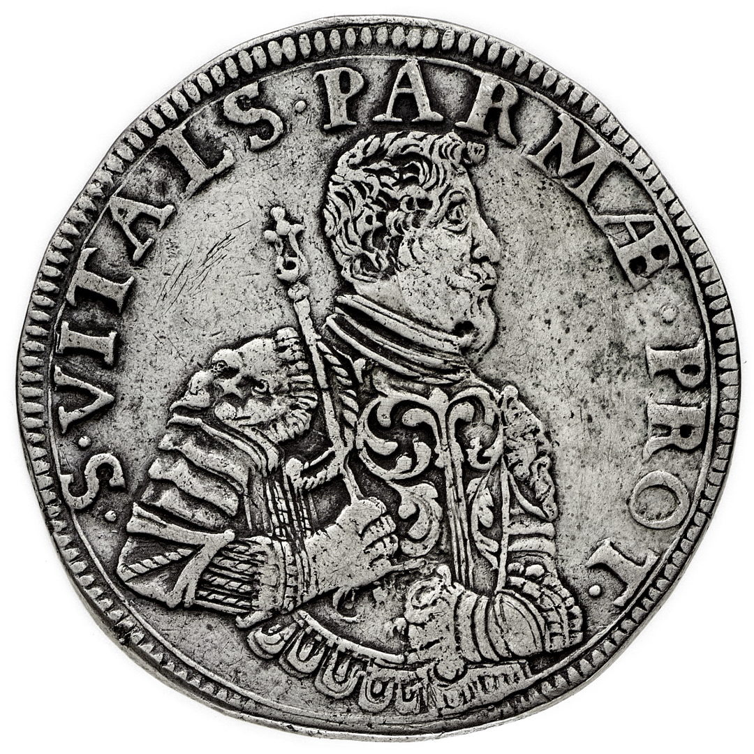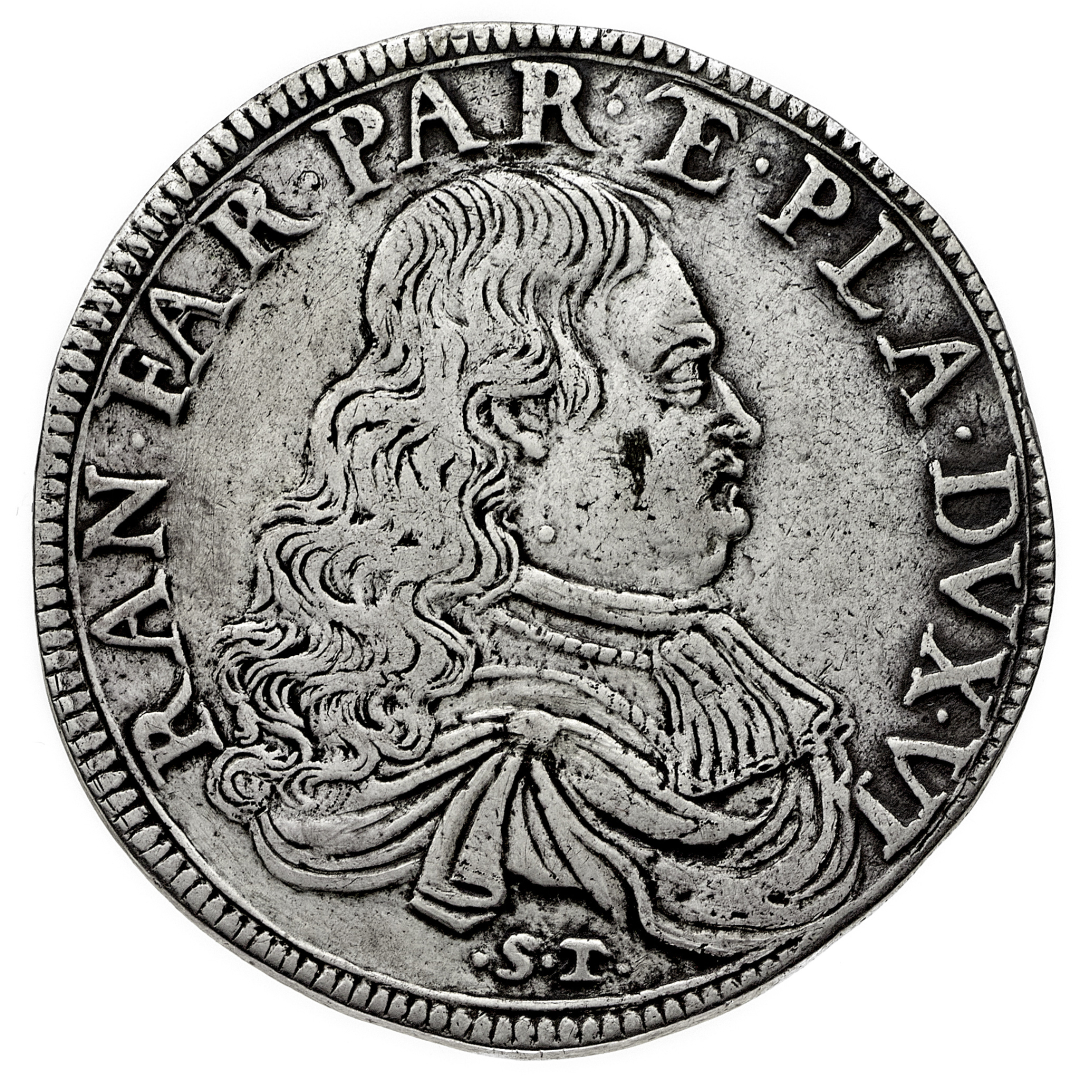 Ranuccio II Farnese (1646-1694) - Scudo Ridotto - Zecca: Parma - Diritto: busto corazzato del Duca a destra - Rovescio: mezzo busto corazzato di San Vitale a destra - gr. 17,29 - Rara - BB