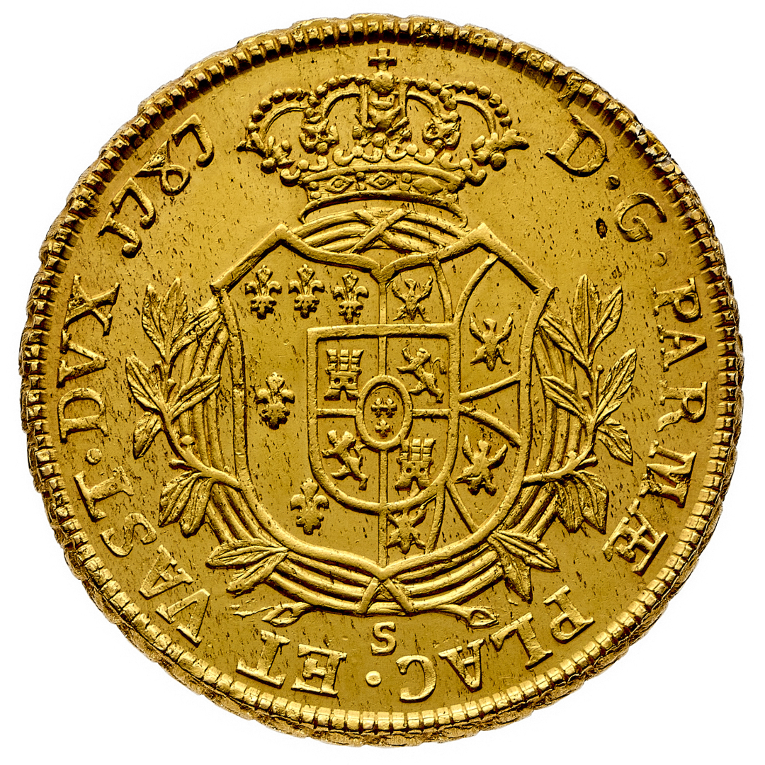Ferdinando I di Borbone (1765-1802) - 4 Doppie 1787 - Zecca: Parma - Diritto: effigie di Ferdinando a destra - Rovescio: stemma coronato e circondato da rami di alloro legati in forma di corona - gr. 28,66 - Rara - Fondi lucenti, migliore di SPL