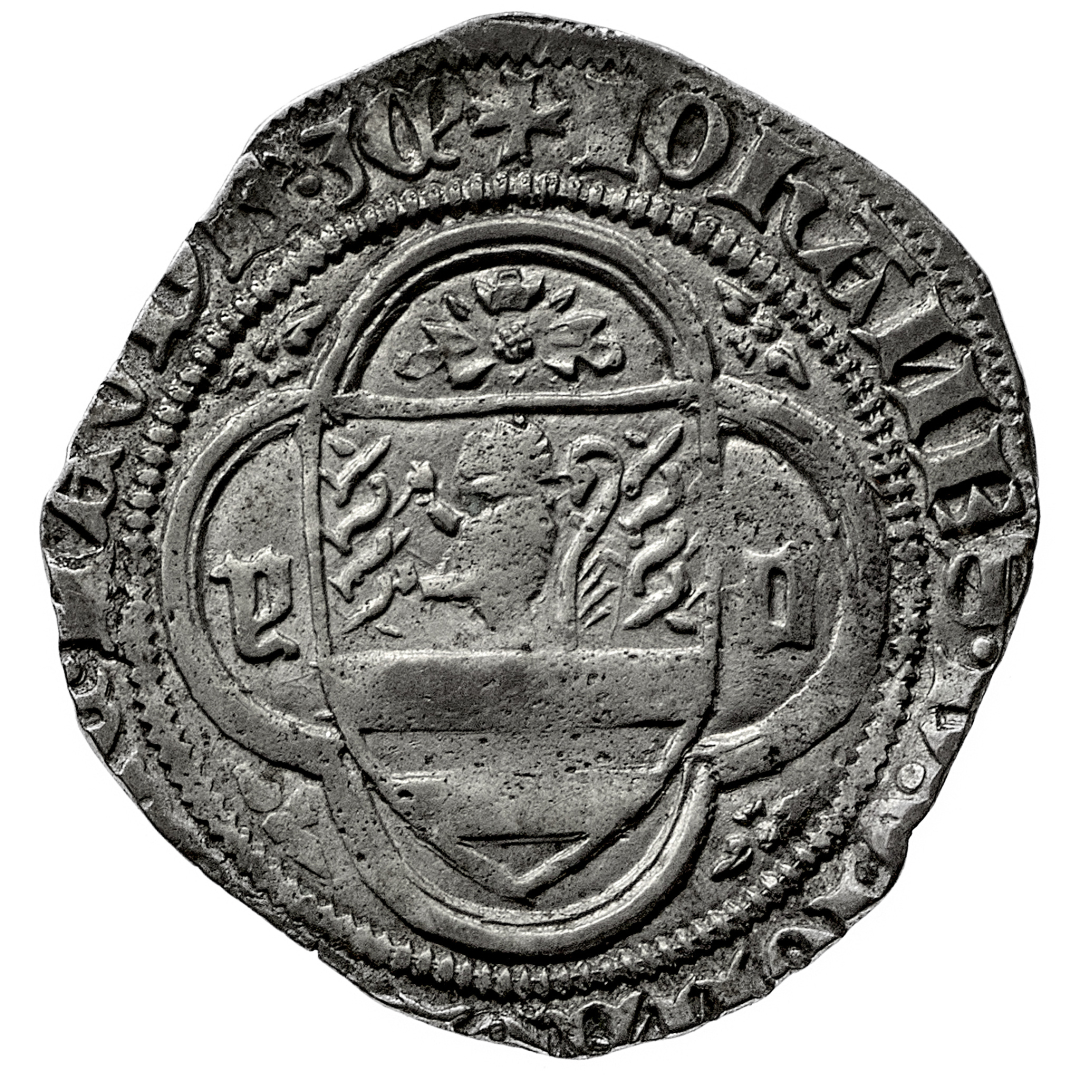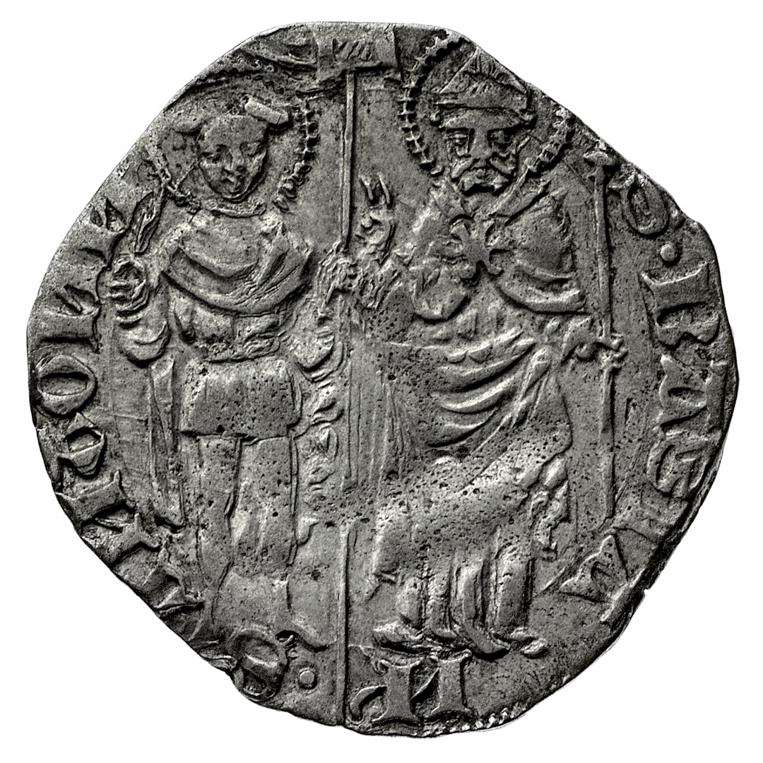 Giovanni da Vignate (1410-1413) - Grosso - Diritto: stemma sormontato da una rosa in cornice quadrilobata - Rovescio: San Bassiano e San Antonino di fronte, benedicenti - gr. 2,16 - Molto rara - Migliore di BB