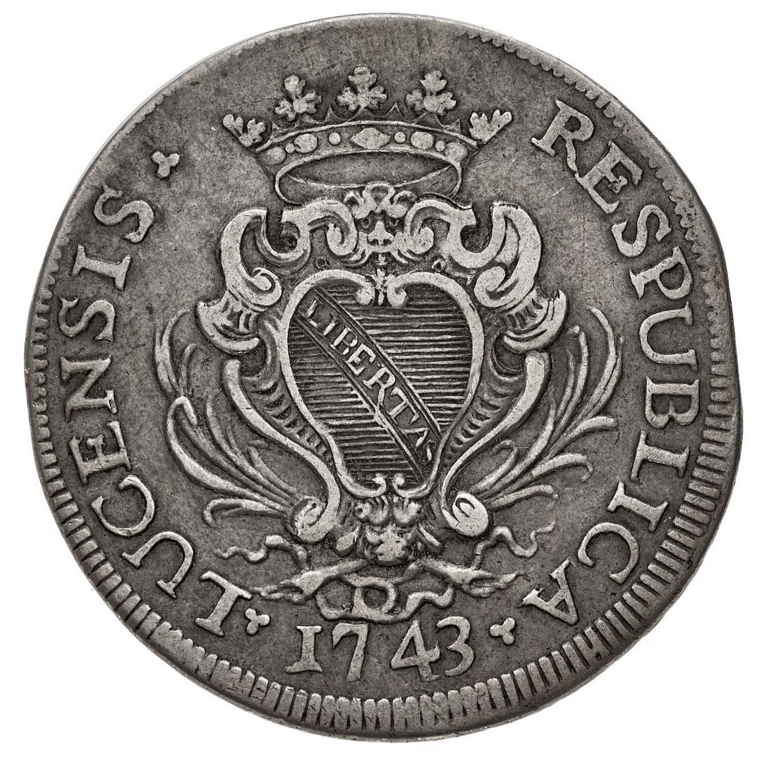 Repubblica (1369-1799) - Scudo 1743 - Diritto: stemma della Repubblica coronato entro due rami di alloro - Rovescio: San Martino a cavallo con elmo e corazza nell'atto di donare a un mendicante parte del proprio mantello - gr. 27,49 - BB