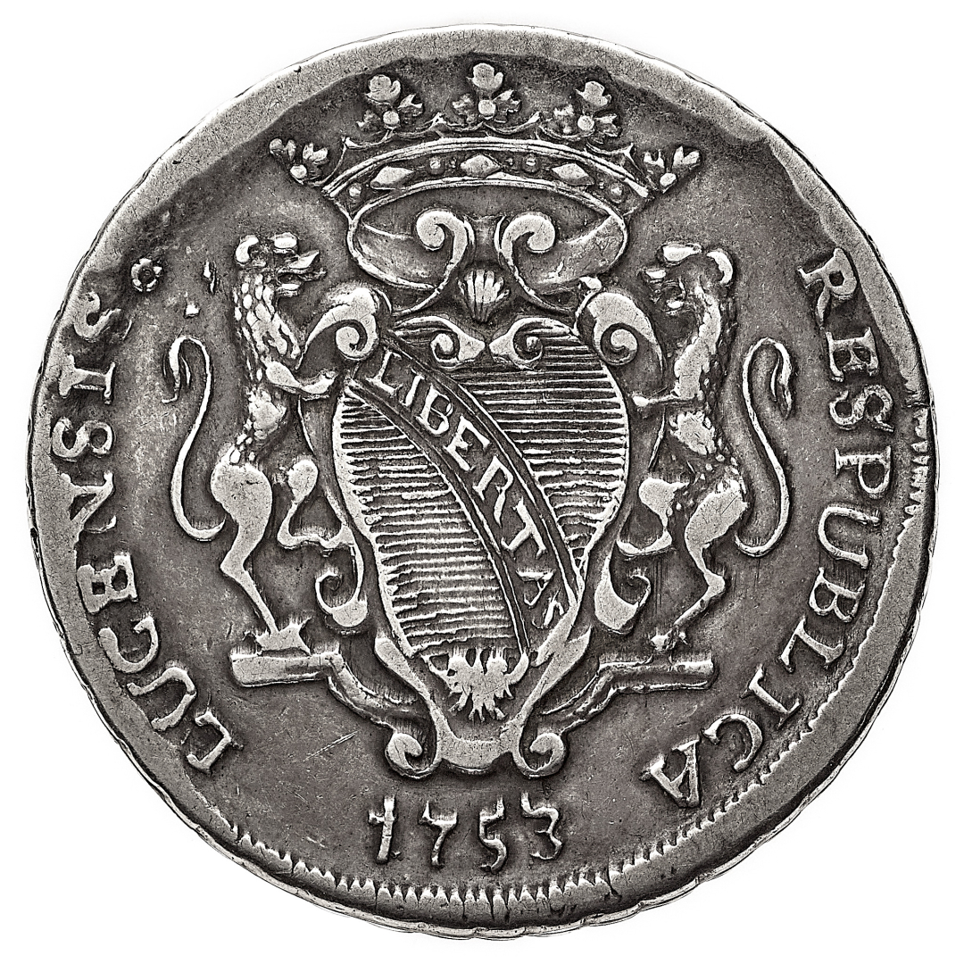Repubblica (1369-1799) - Scudo 1753 - Diritto: stemma della Repubblica coronato e ornato ai lati da due leoni - Rovescio: San Martino a cavallo con elmo e corazza nell'atto di donare a un mendicante parte del proprio mantello - gr. 25,81 - BB