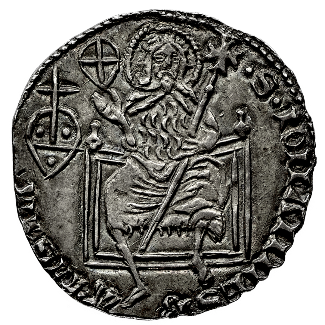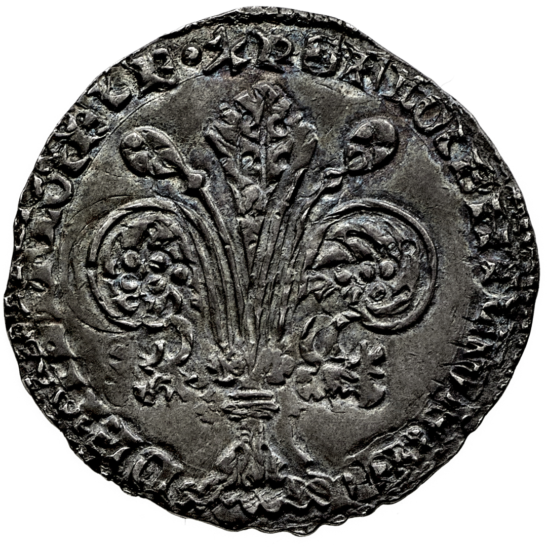 Repubblica (1189-1532) - Grosso Guelfo da 5 Soldi databile al I semestre 1406 - Diritto: giglio fiorentino - Rovescio: San Giovanni Battista seduto di fronte tiene un'asta culminante con una croce con la mano sinistra e alza la destra nell'atto di benedire - gr. 2,53 - Maestro di zecca Giovanni di Bicci Medici - Splendida patina iridescente, migliore di SPL - Proveniente dalla collezione Ex Nummis Historia XI (Magnaguti), asta P. & P. Santamaria, 4-5.6.1956, n. 256