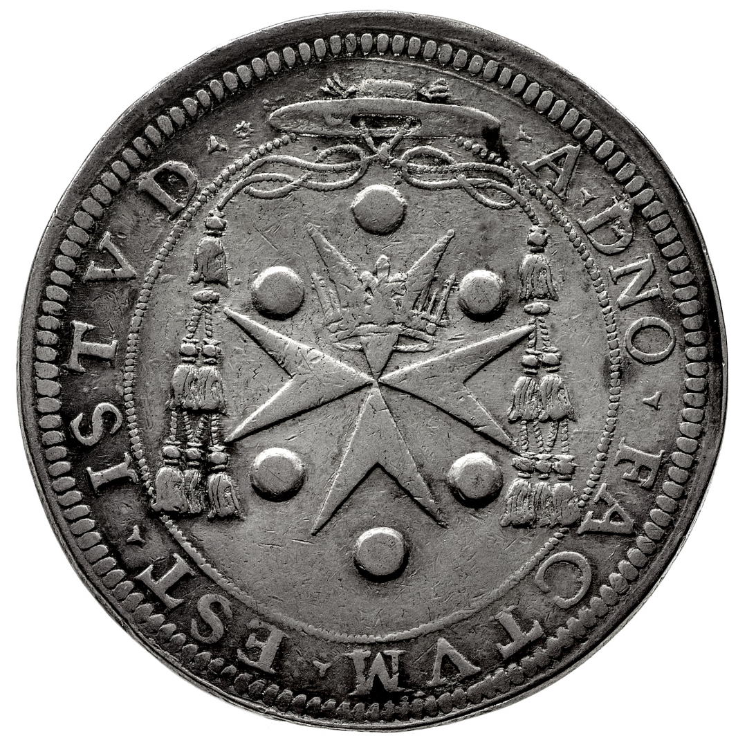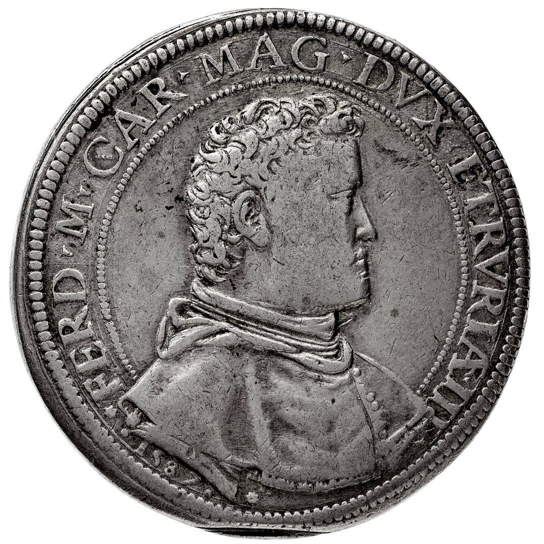 Ferdinando I de' Medici (1587-1608) - Piastra 1587 - Zecca: Firenze - Diritto: busto del Granduca a destra in abito cardinalizio - Rovescio: croce di Santo Stefano ornata sulla corona granducale, sormontata dal cappello cardinalizio con cordini e fiocchi - gr. 32,35 - Non comune - BB