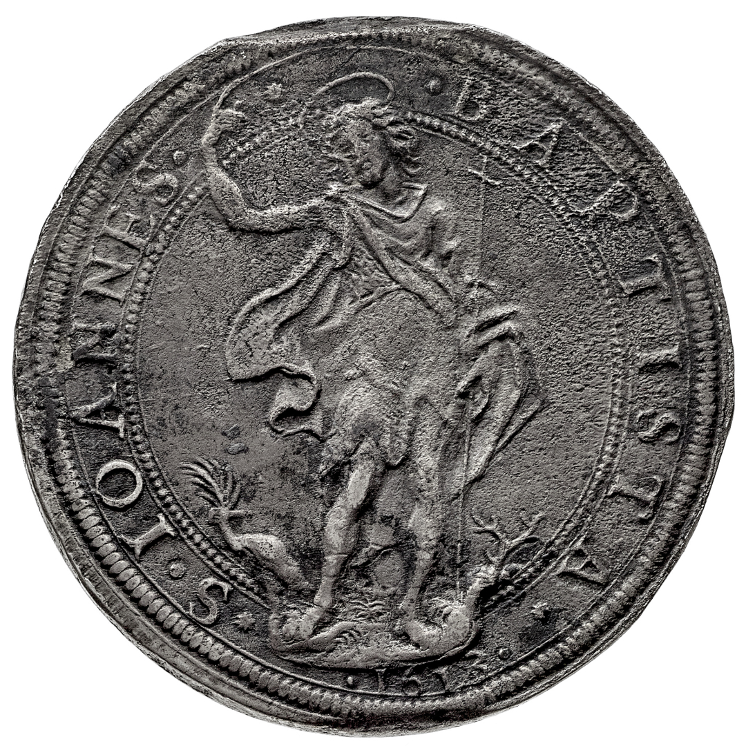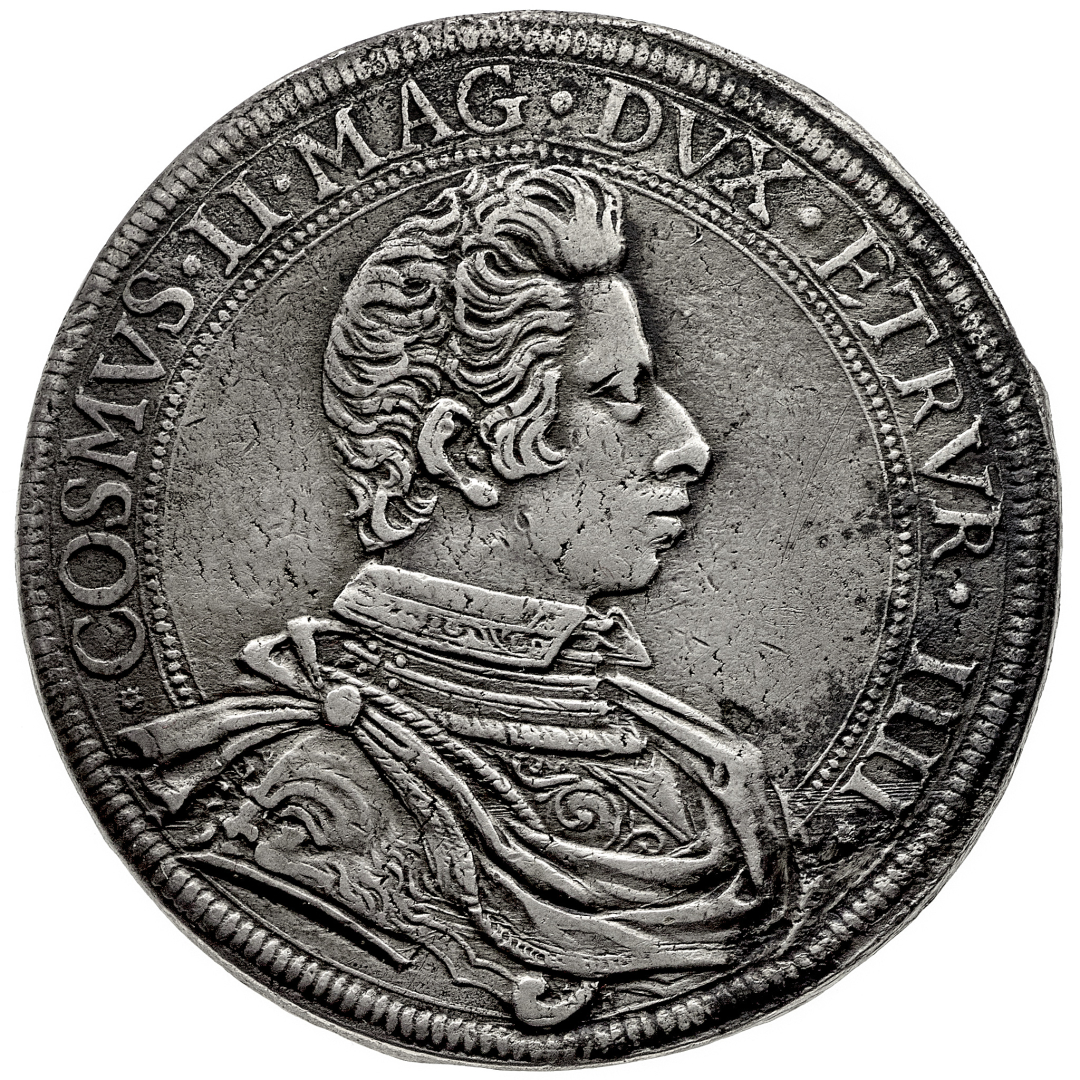 Cosimo II de' Medici (1608-1621) - Piastra 1613 - Zecca: Firenze - Diritto: busto drappeggiato e corazzato del Granduca a destra - Rovescio: San Giovanni Battista stante di fronte alza la mano destra benedicente e tiene una lunga croce con la sinistra - gr. 32,02 - Rara - Lieve porosità del metallo, migliore di BB