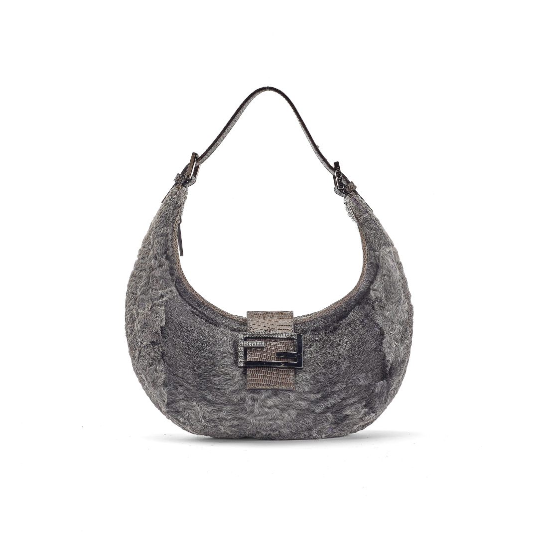 grey Breitschwanz fur with Lizard-effect leather detail. Interior in red fabric, adjustable handle.