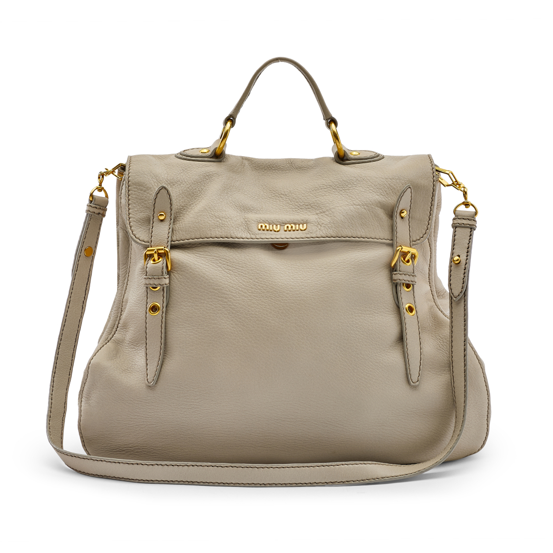 ice deer leather with blue, red and sand check fabric lining. Leather handle and detachable shoulder strap. Logoed flap closure with magnet and adjustable front straps. One front zip pocket with logoed pull. Golden-tone metal hardware.