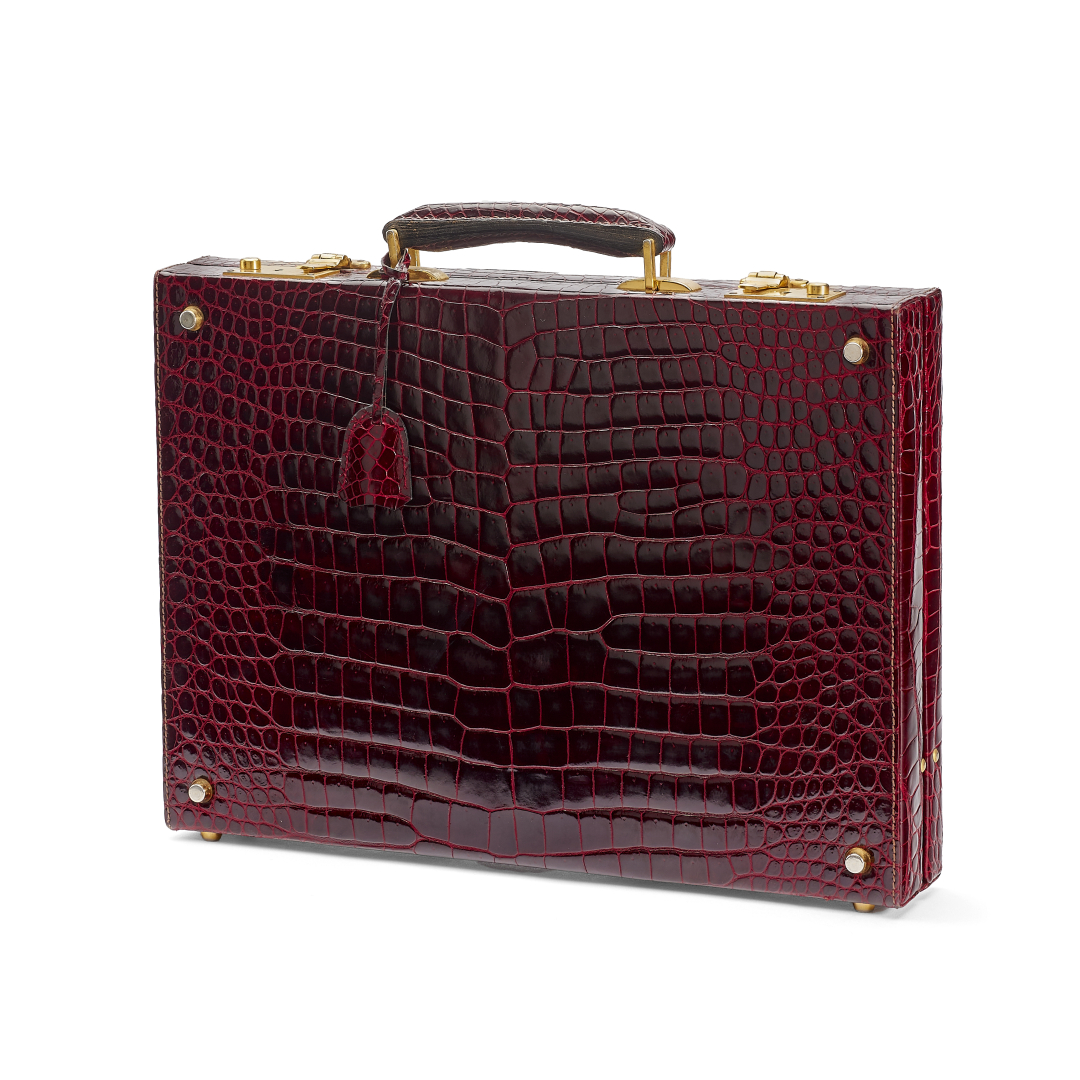burgundy crocodile leather, burgundy leather lining. Crocodile handle, double snap-lock closure. Includes clochette and set of keys. Golden-tone metal hardware.