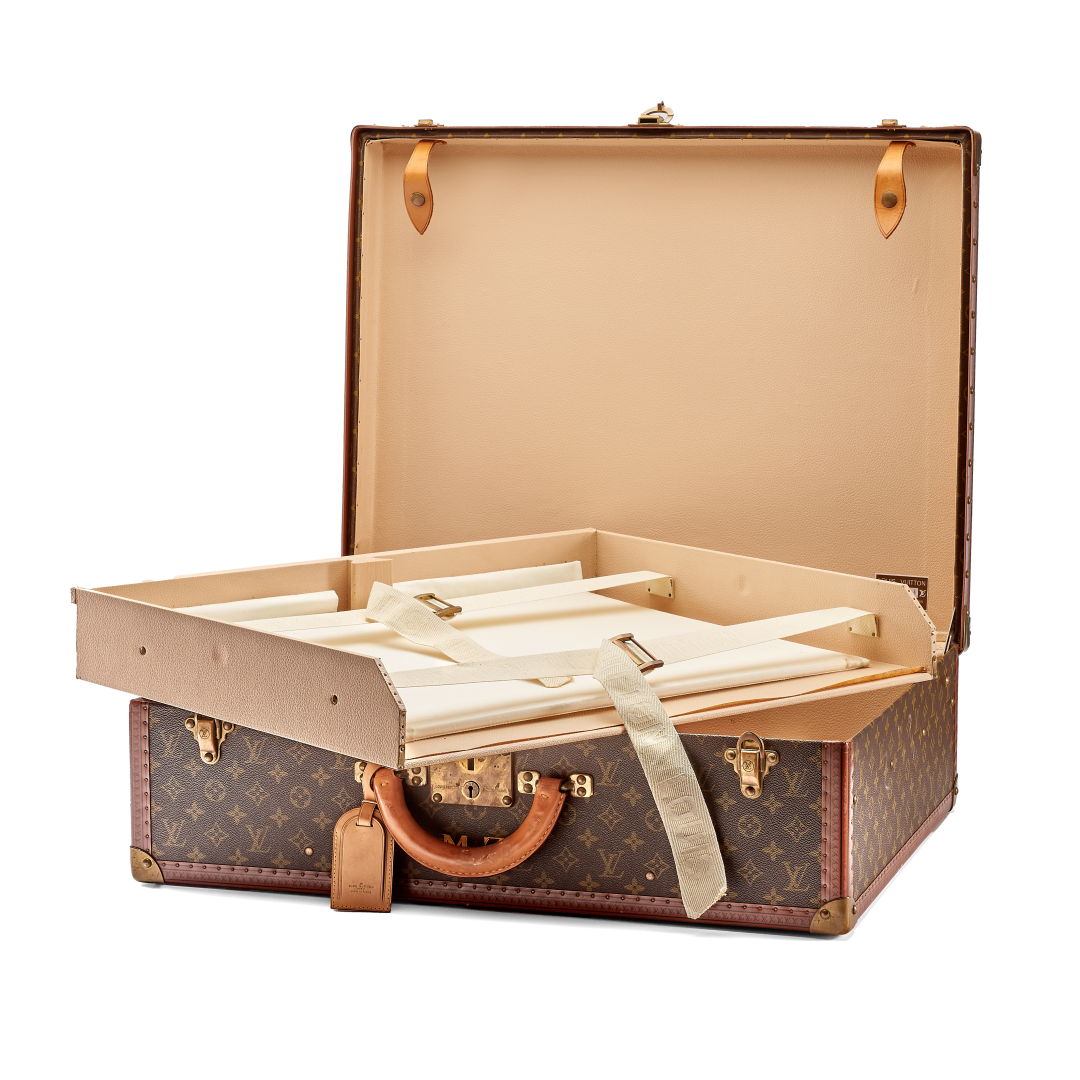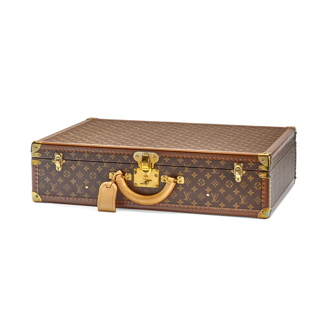 Monogram canvas with beige Vuittonite interior and two logoed cotton straps. Cowhide handle, S-lock clasp reinforced by two additional latches. Includes name tag, key set and cover. Losine trim with metal corners. Golden-tone metal hardware.