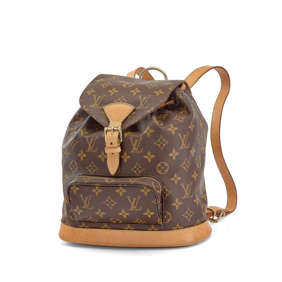 brown Monogram canvas, biscuit-colored canvas interior. Adjustable shoulder straps and cowhide trim. Drawstring closure, flap secured by adjustable buckle. One front zip pocket. Golden-tone metal hardware.