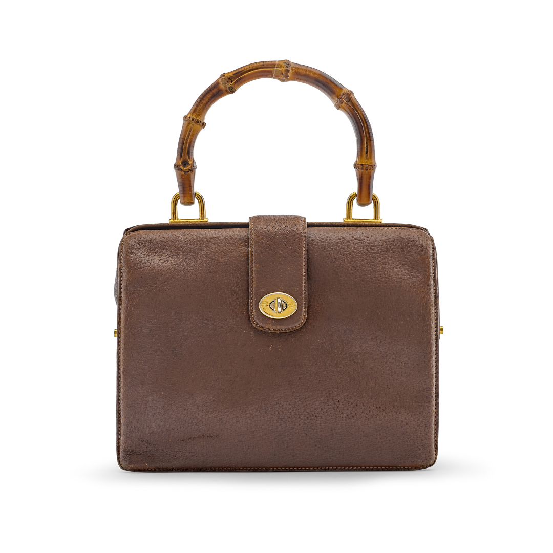 chestnut boar leather, brown suede lining. Bamboo handle, flap closure with logoed turn-lock. Golden-tone metal hardware.