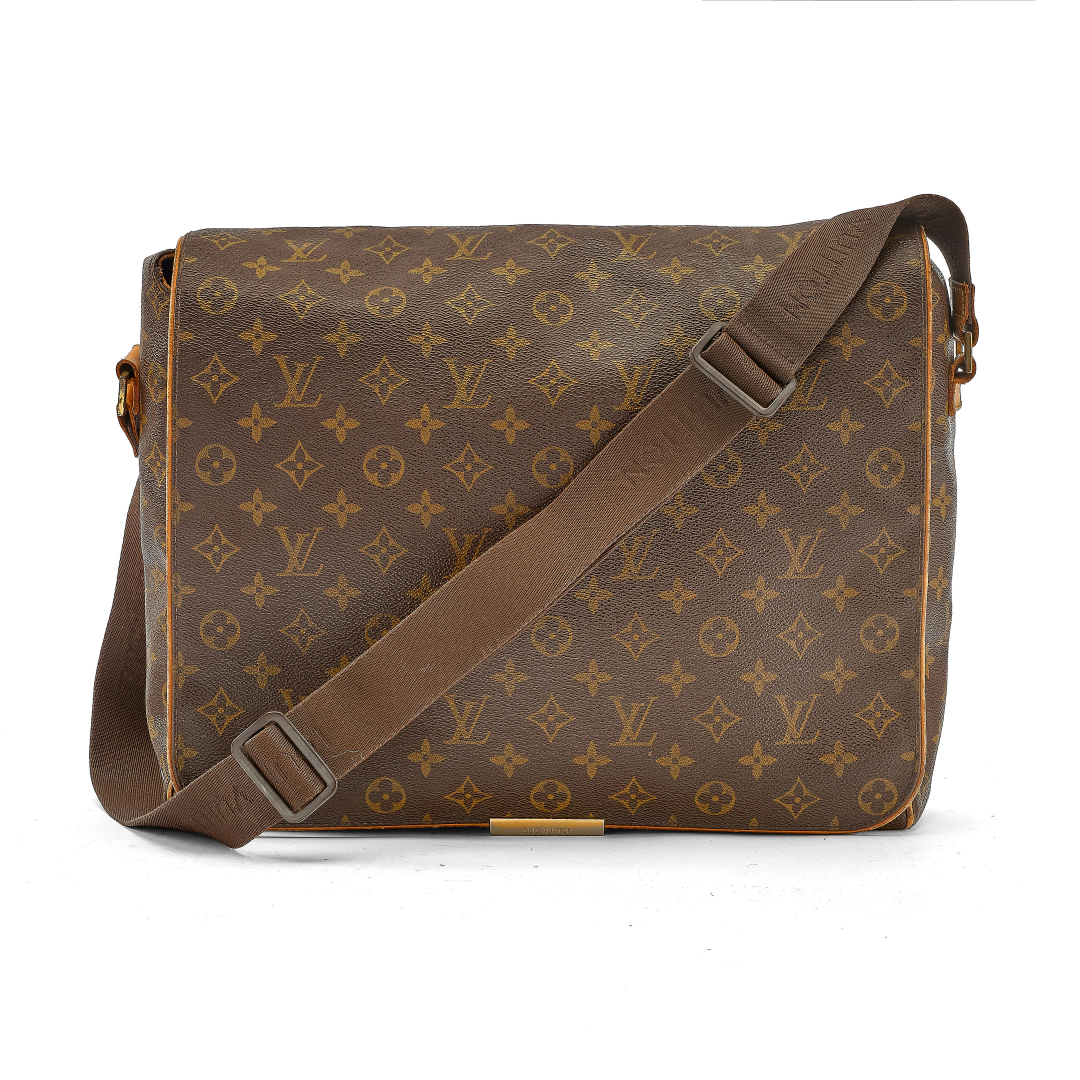 brown Monogram canvas with cowhide trim, biscuit-tone fabric interior. Adjustable brown cotton logo strap. Flap closure with elastic fastening. Two concealed front pockets and one front pocket beneath the handle. Personalized with initials M.V.. Golden-tone metal hardware.