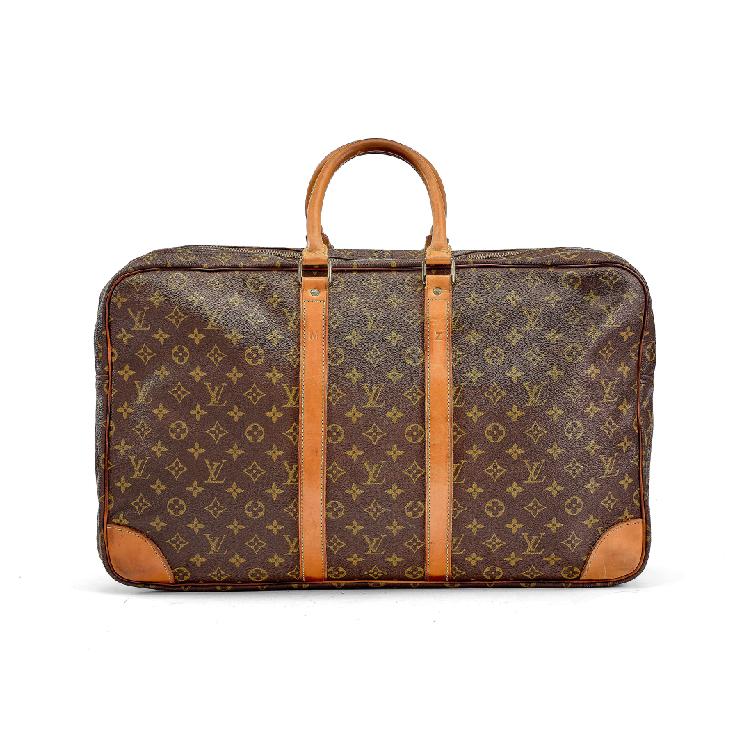 brown Monogram canvas with beige fabric interior. Double handle and cowhide trim. Three zip compartments. Complete with combination padlock. Golden-tone metal hardware.