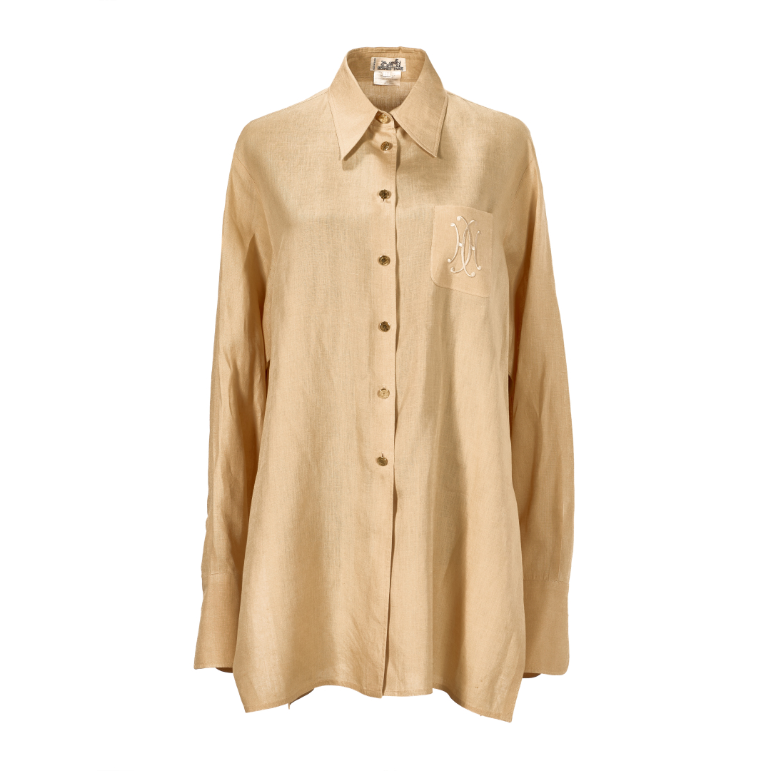 sand linen with ton sur ton embroidered logo on chest pocket. Shirt front and cuffs fastened with eleven gilded Clou de Selle buttons.
