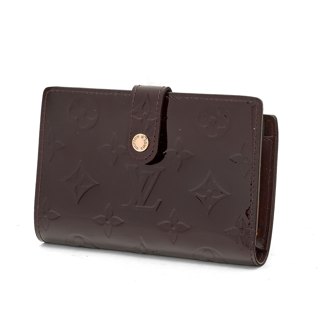 amaranth Monogram Vernis patent leather. Three-section interior: one coin compartment with clasp, one bill section, eight card slots, and two flat pockets. Flap closure with snap button. Golden-tone metal hardware.