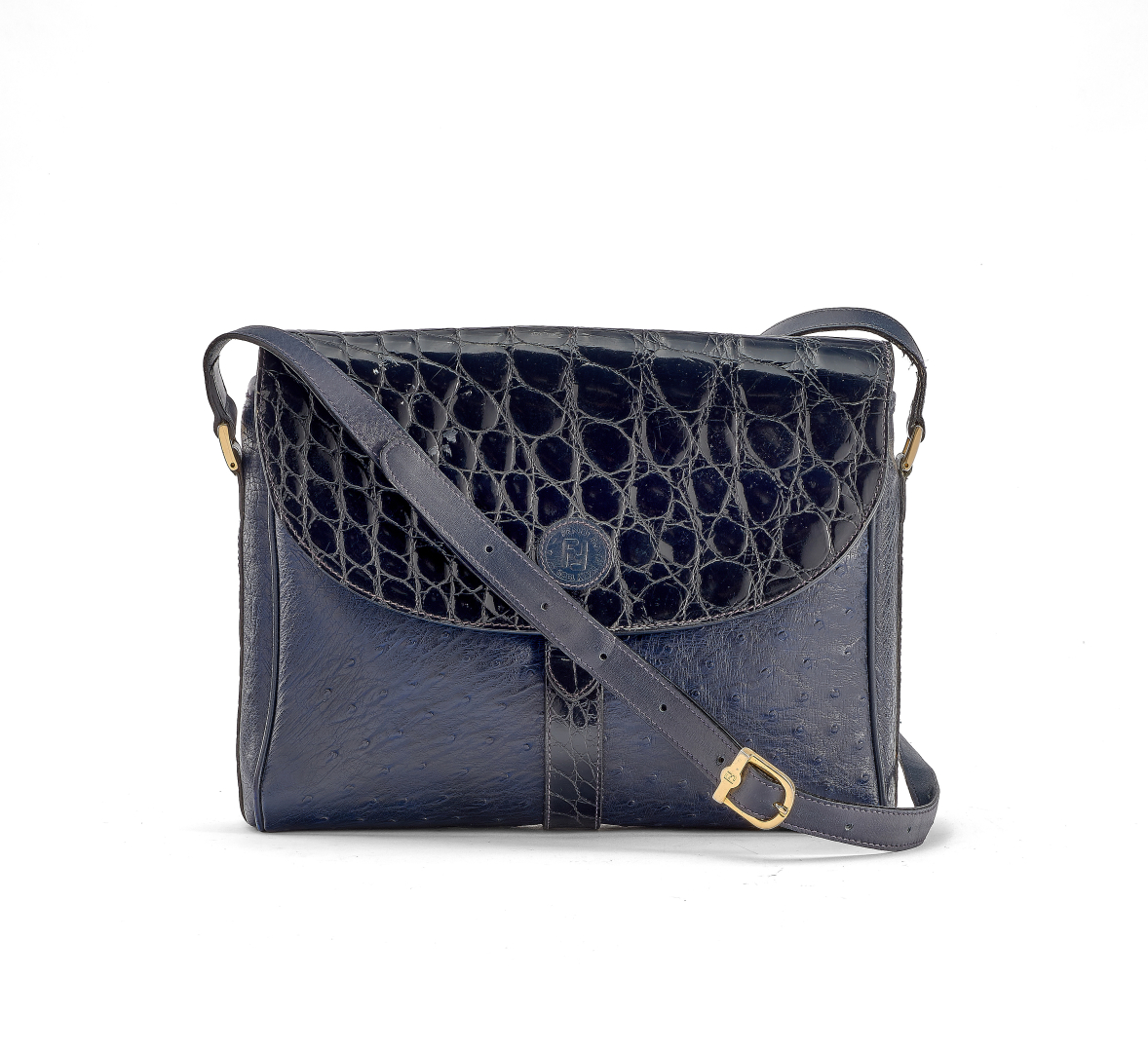 blue ostrich and crocodile leather with blue leather interior. Adjustable blue leather strap. Flap closure with magnetic fastening and logo detail. Golden-tone metal hardware.
