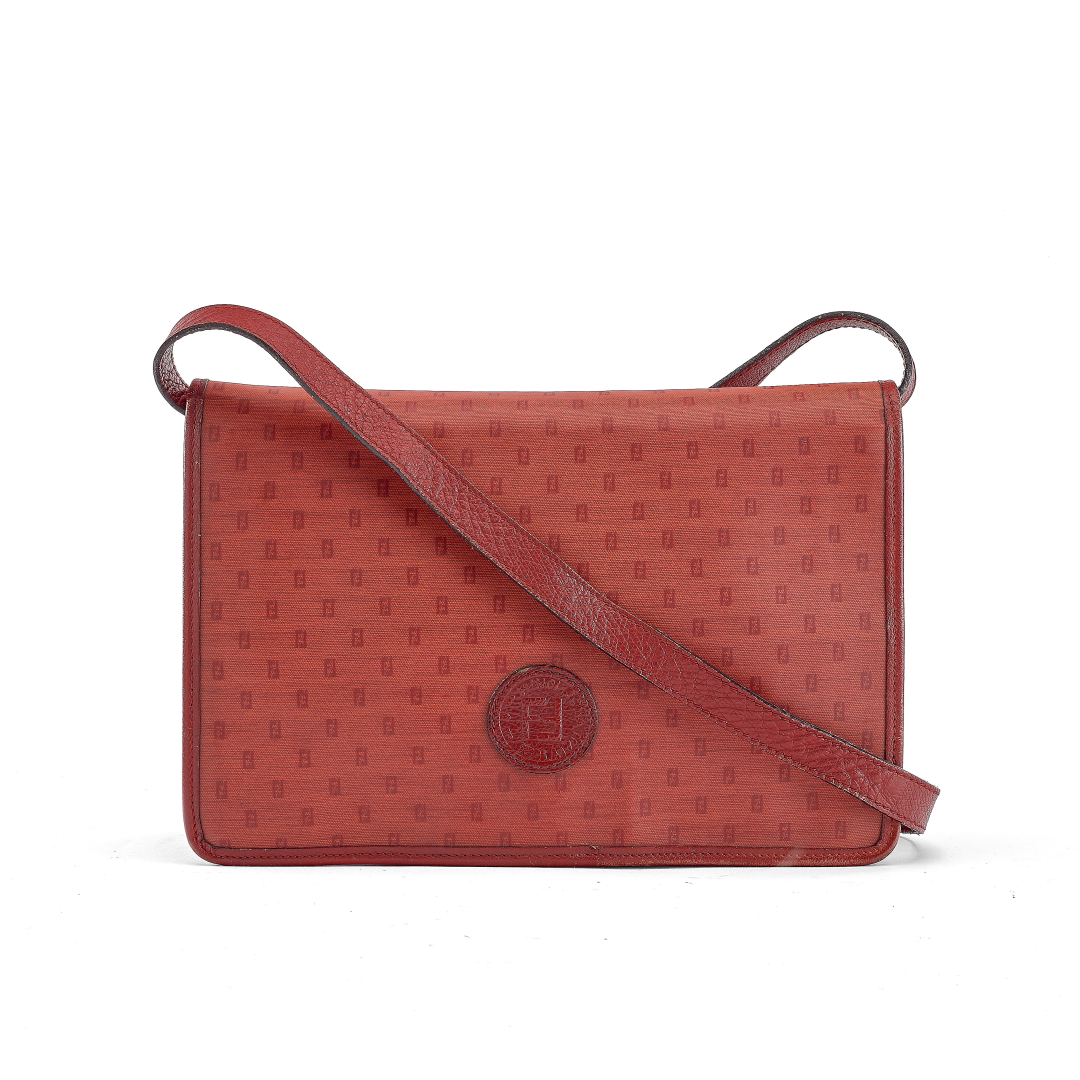 rubberized micro logo fabric and red leather, red logoed leather lining. Removable and adjustable red leather shoulder strap. Flap closure with magnetic snap. Silver-tone metal hardware.