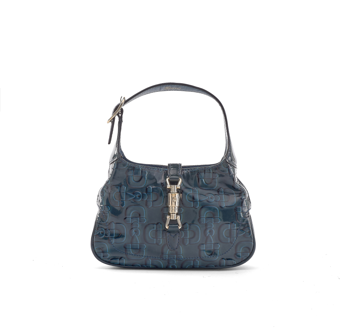 teal patent leather, interior in matching fabric. Adjustable patent handle, strap fastening with piston lock. Silver-tone metal hardware.