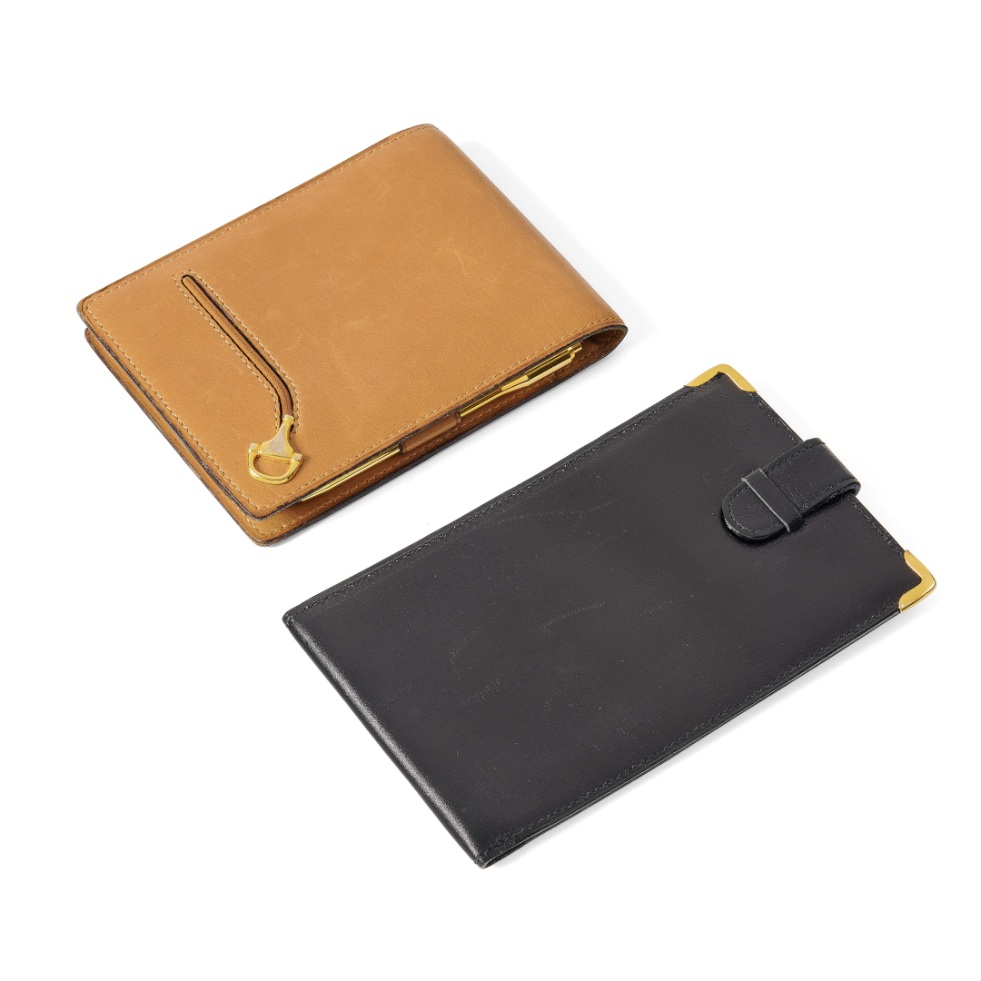 beige and black leather. The notepad, including original ballpoint pen, features the original refill and two card slots, with front stirrup detail. Check holder with loop closure. Golden-tone metal hardware.