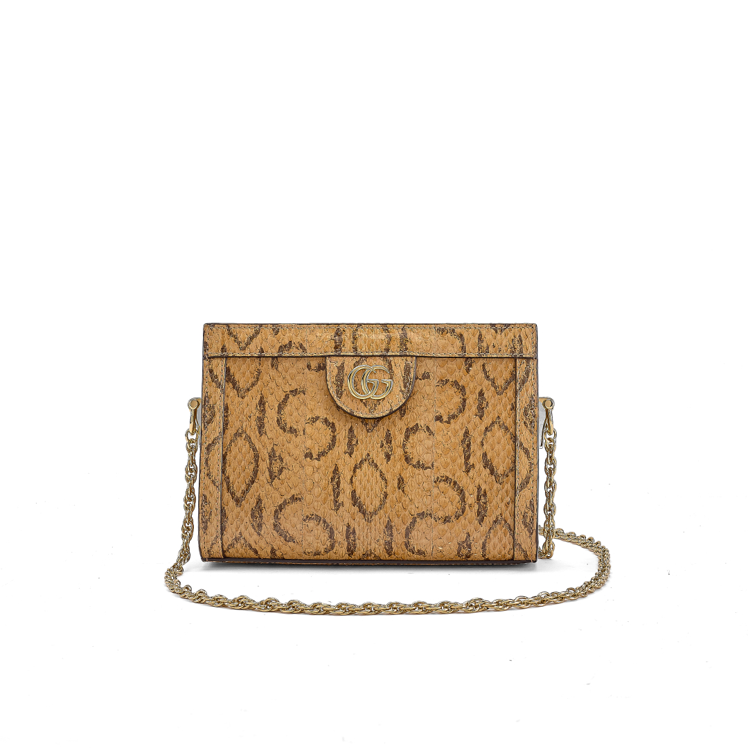 beige python, camel nappa lining. Golden mesh shoulder strap. Double magnetic closure. Golden-tone metal hardware.