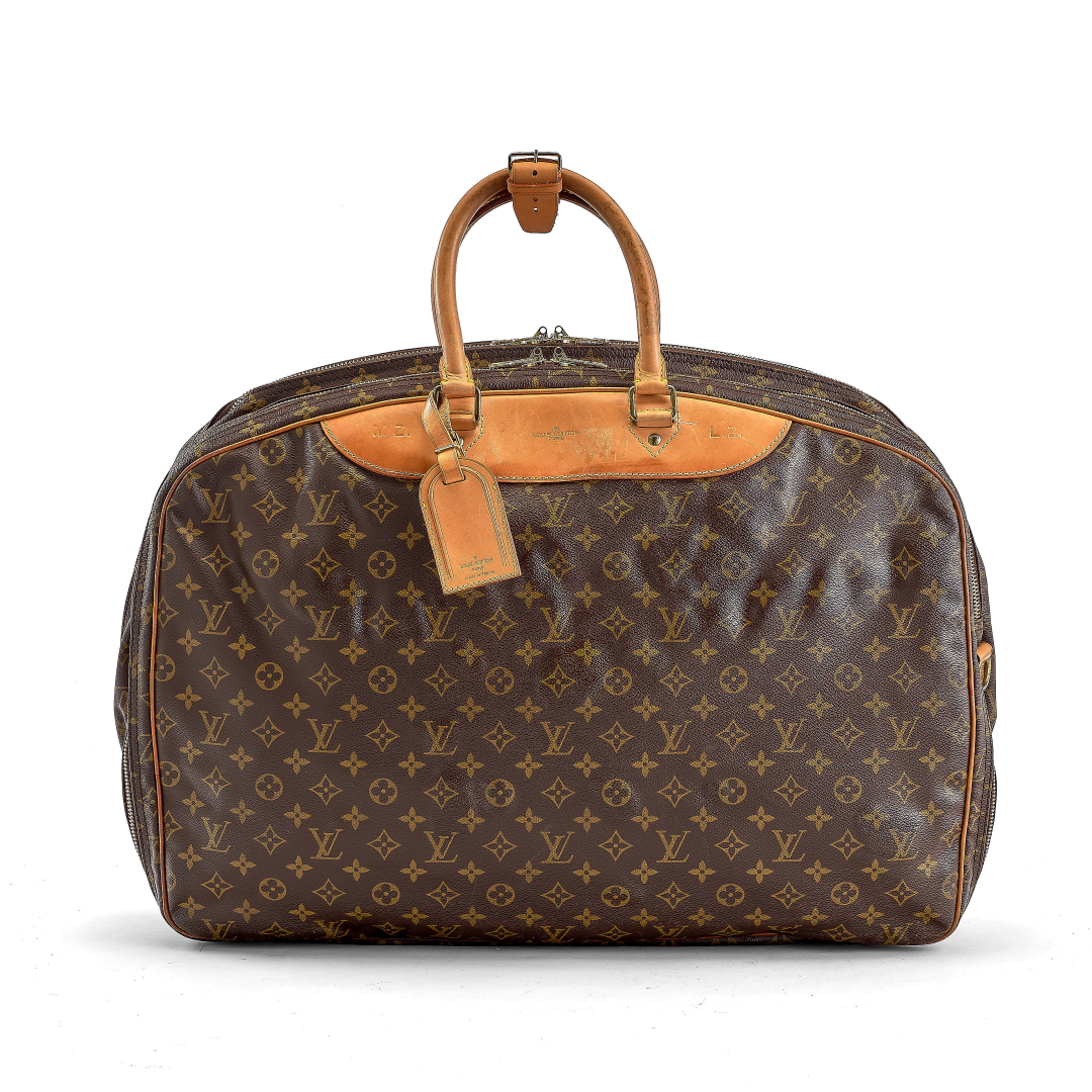 Brown Monogram canvas with beige fabric interior. Double handle and cowhide trim. One detachable and adjustable logoed canvas shoulder strap (non-coeval). Personalized with initials M.Z. Three zip compartments with double pullers. Complete with removable name tag. Golden-tone metal hardware.