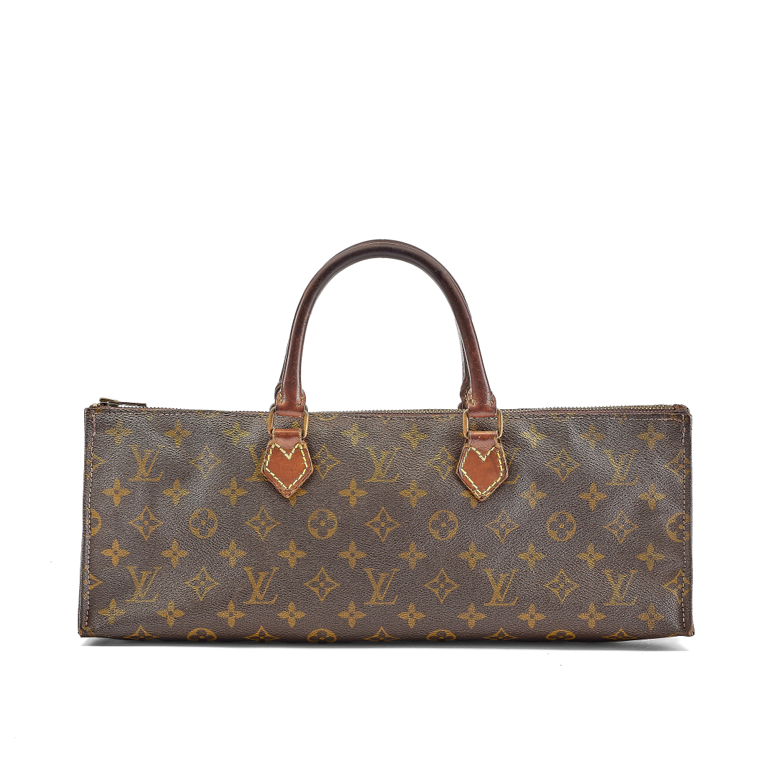 brown Monogram canvas, leather lining. Double handle and cowhide trim. Zip closure. Golden-tone metal hardware.