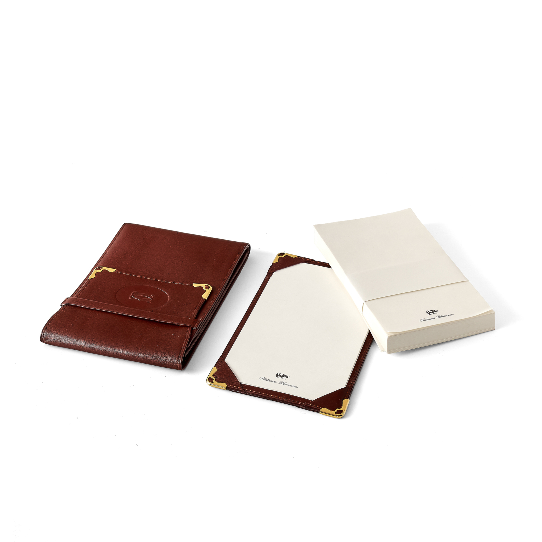 Notepad holder in burgundy leather with one side pocket, embossed logo. Golden-tone metal hardware.