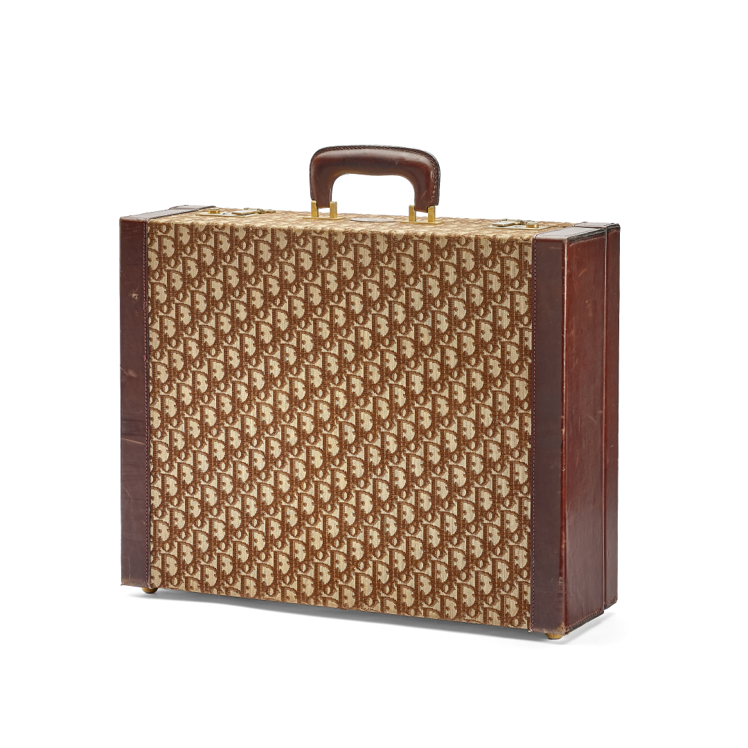 beige Monogram Oblique jacquard canvas, cream fabric interior with two cotton straps. Brown leather handle and trims. Personalized with initials M.Z. Double snap closure, complete with clochette and key set. Golden-tone metal hardware.